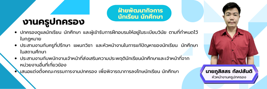 | 1 | นายภูสิสสร กัลปสันติ | ตำแหน่ง: | หัวหน้างานปกครอง |