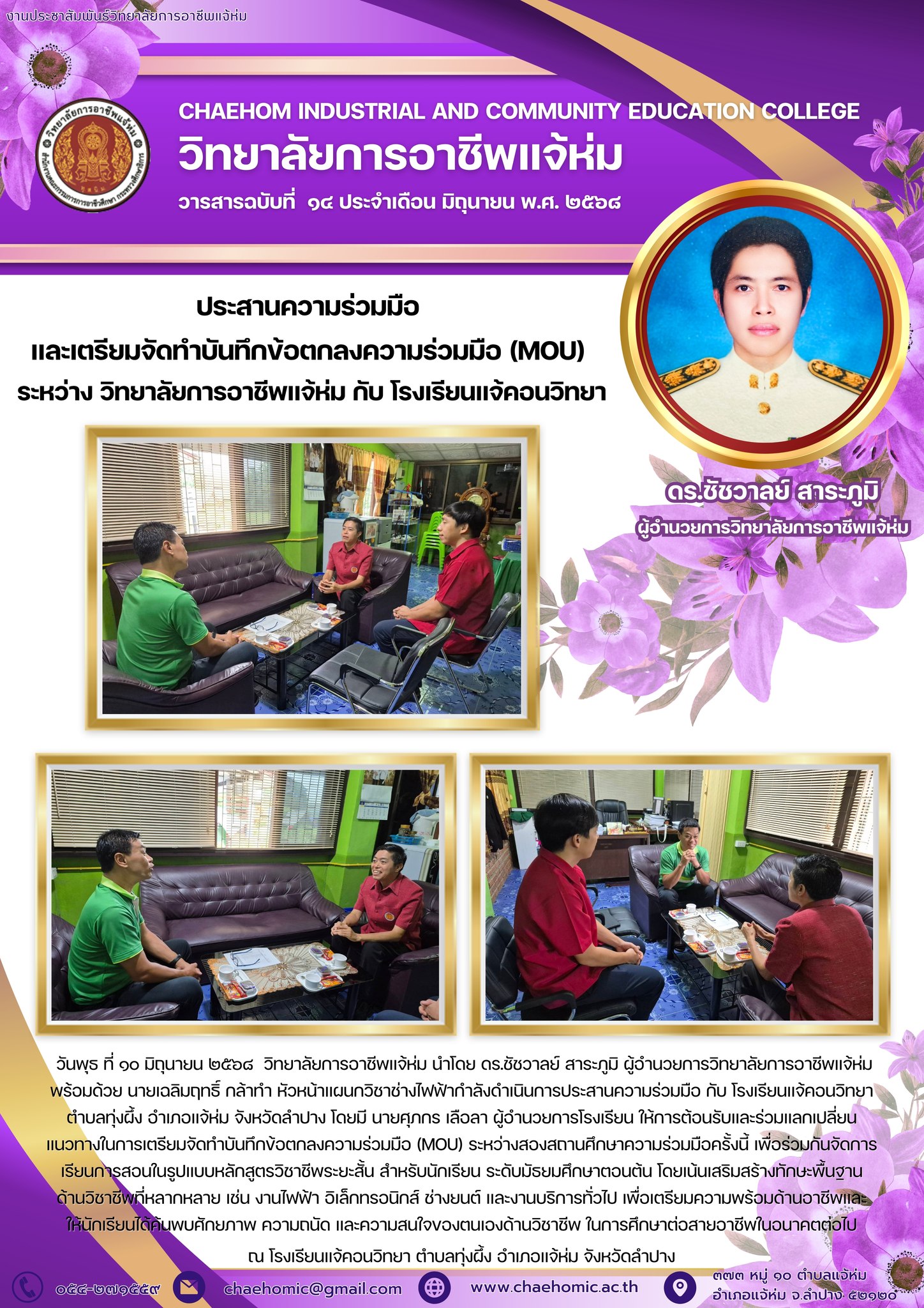 วันพุธ ที่ ๑๐ มิถุนายน ๒๕๖๘ วิทยาลัยการอาชีพแจ้ห่ม นำโดย ดร.ชัชวาลย์ สาระภูมิ ผู้อำนวยการวิทยาลัยการอาชีพแจ้ห่ม พร้อมด้วย นายเฉลิมฤทธิ์ กล้าทำ หัวหน้าแผนกวิชาช่างไฟฟ้ากำลังดำเนินการประสานความร่วมมือ กับ โรงเรียนแจ้คอนวิทยา ตำบลทุ่งผึ้ง อำเภอแจ้ห่ม จังหวัดลำปาง โดยมี นายศุภกร เลือลา ผู้อำนวยการโรงเรียน ให้การต้อนรับและร่วมแลกเปลี่ยนแนวทางในการเตรียมจัดทำบันทึกข้อตกลงความร่วมมือ (MOU) ระหว่างสองสถานศึกษาความร่วมมือครั้งนี้ เพื่อร่วมกันจัดการเรียนการสอนในรูปแบบหลักสูตรวิชาชีพระยะสั้น สำหรับนักเรียน ระดับมัธยมศึกษาตอนต้น โดยเน้นเสริมสร้างทักษะพื้นฐานด้านวิชาชีพที่หลากหลาย เช่น งานไฟฟ้า อิเล็กทรอนิกส์ ช่างยนต์ และงานบริการทั่วไป เพื่อเตรียมความพร้อมด้านอาชีพและให้นักเรียนได้ค้นพบศักยภาพ ความถนัด และความสนใจของตนเองด้านวิชาชีพ ในการศึกษาต่อสายอาชีพในอนาคตต่อไป ณ โรงเรียนแจ้คอนวิทยา ตำบลทุ่งผึ้ง อำเภอแจ้ห่ม จังหวัดลำปาง
