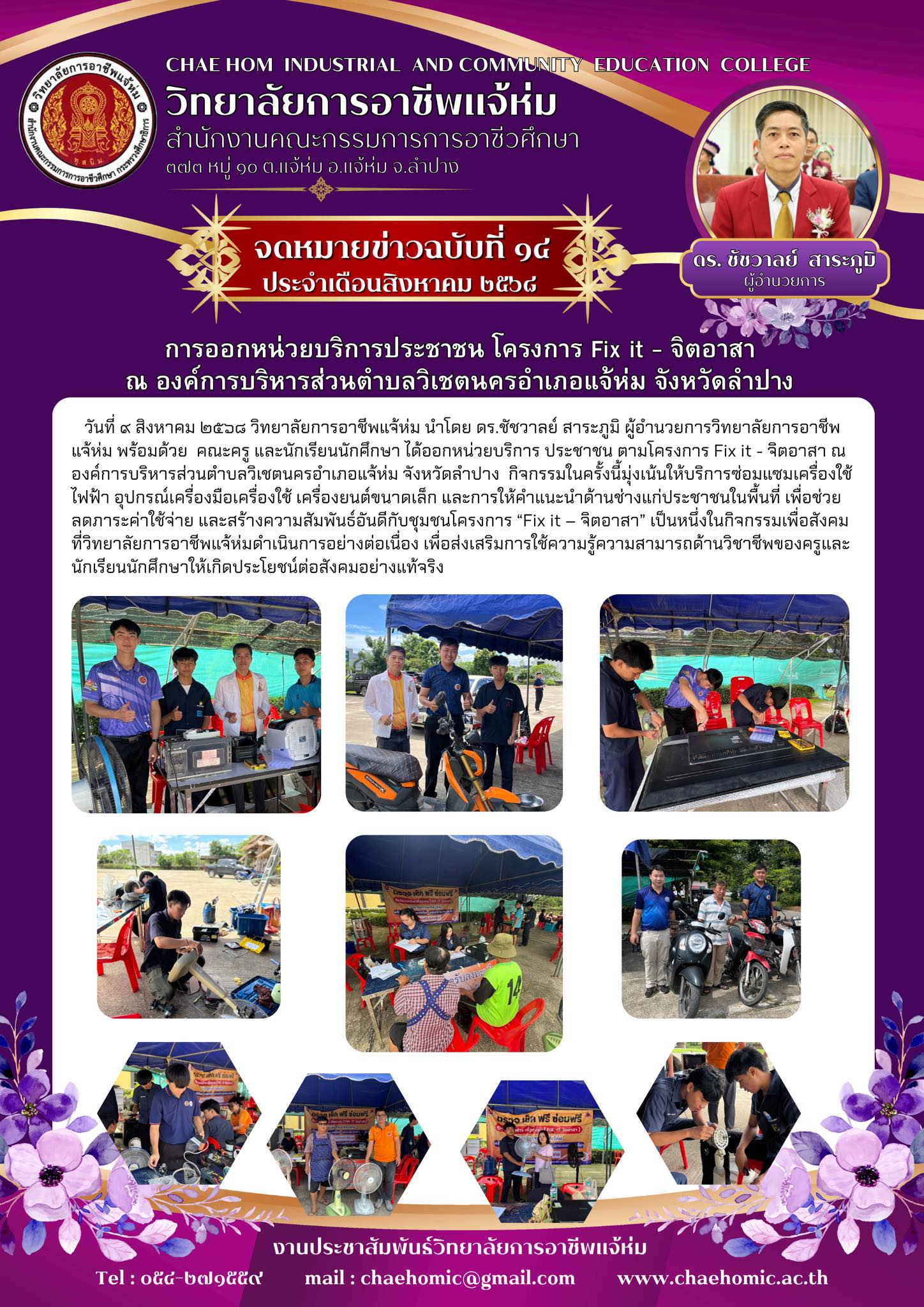 วันที่ 9 สิงหาคม 2568 วิทยาลัยการอาชีพแจ้ห่ม นำโดย ดร.ชัชวาลย์ สาระภูมิ ผู้อำนวยการวิทยาลัยการอาชีพแจ้ห่ม พร้อมด้วย คณะครู และนักเรียนนักศึกษา ได้ออกหน่วยบริการ ประชาชน ตามโครงการ Fix it – จิตอาสา ณ องค์การบริหารส่วนตำบลวิเชตนครอำเภอแจ้ห่ม จังหวัดลำปาง กิจกรรมในครั้งนี้มุ่งเน้นให้บริการซ่อมแซมเครื่องใช้ไฟฟ้า อุปกรณ์เครื่องมือเครื่องใช้ เครื่องยนต์ขนาดเล็ก และการให้คำแนะนำด้านช่างแก่ประชาชนในพื้นที่ เพื่อช่วยลดภาระค่าใช้จ่าย และสร้างความสัมพันธ์อันดีกับชุมชนโครงการ “Fix it – จิตอาสา” เป็นหนึ่งในกิจกรรมเพื่อสังคมที่วิทยาลัยการอาชีพแจ้ห่มดำเนินการอย่างต่อเนื่อง เพื่อส่งเสริมการใช้ความรู้ความสามารถด้านวิชาชีพของครูและนักเรียนนักศึกษาให้เกิดประโยชน์ต่อสังคมอย่างแท้จริง