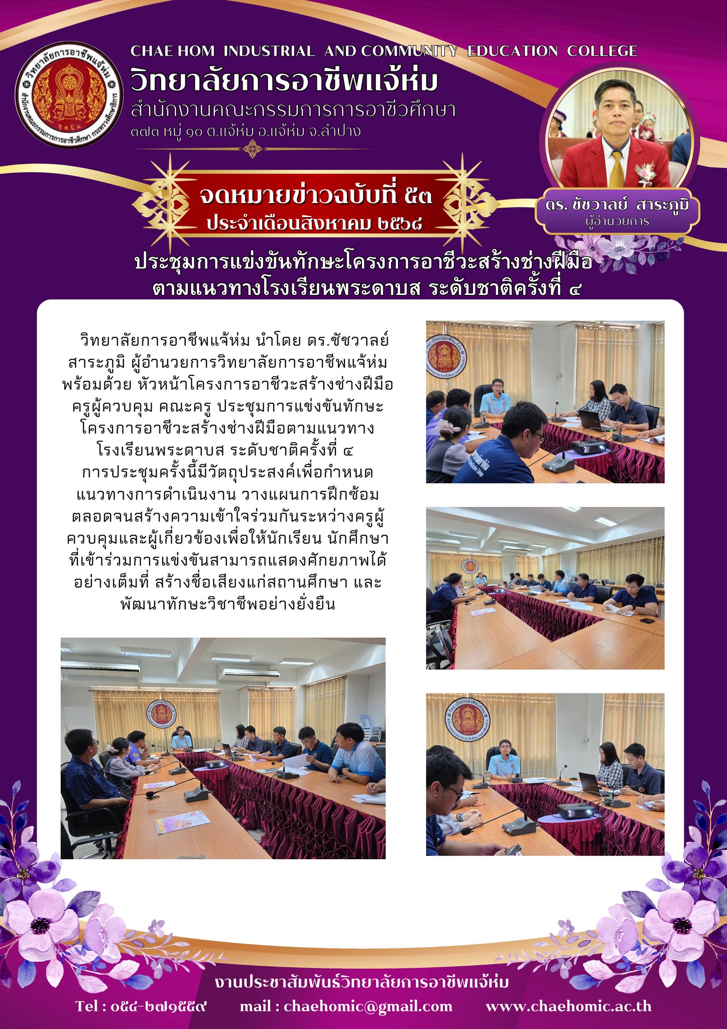 วิทยาลัยการอาชีพแจ้ห่ม นำโดย ดร.ชัชวาลย์ สาระภูมิ ผู้อำนวยการวิทยาลัยการอาชีพแจ้ห่ม พร้อมด้วย หัวหน้าโครงการอาชีวะสร้างช่างฝีมือ ครูผู้ควบคุม คณะครู ประชุมการแข่งขันทักษะโครงการอาชีวะสร้างช่างฝีมือตามแนวทางโรงเรียนพระดาบส ระดับชาติครั้งที่ ๔