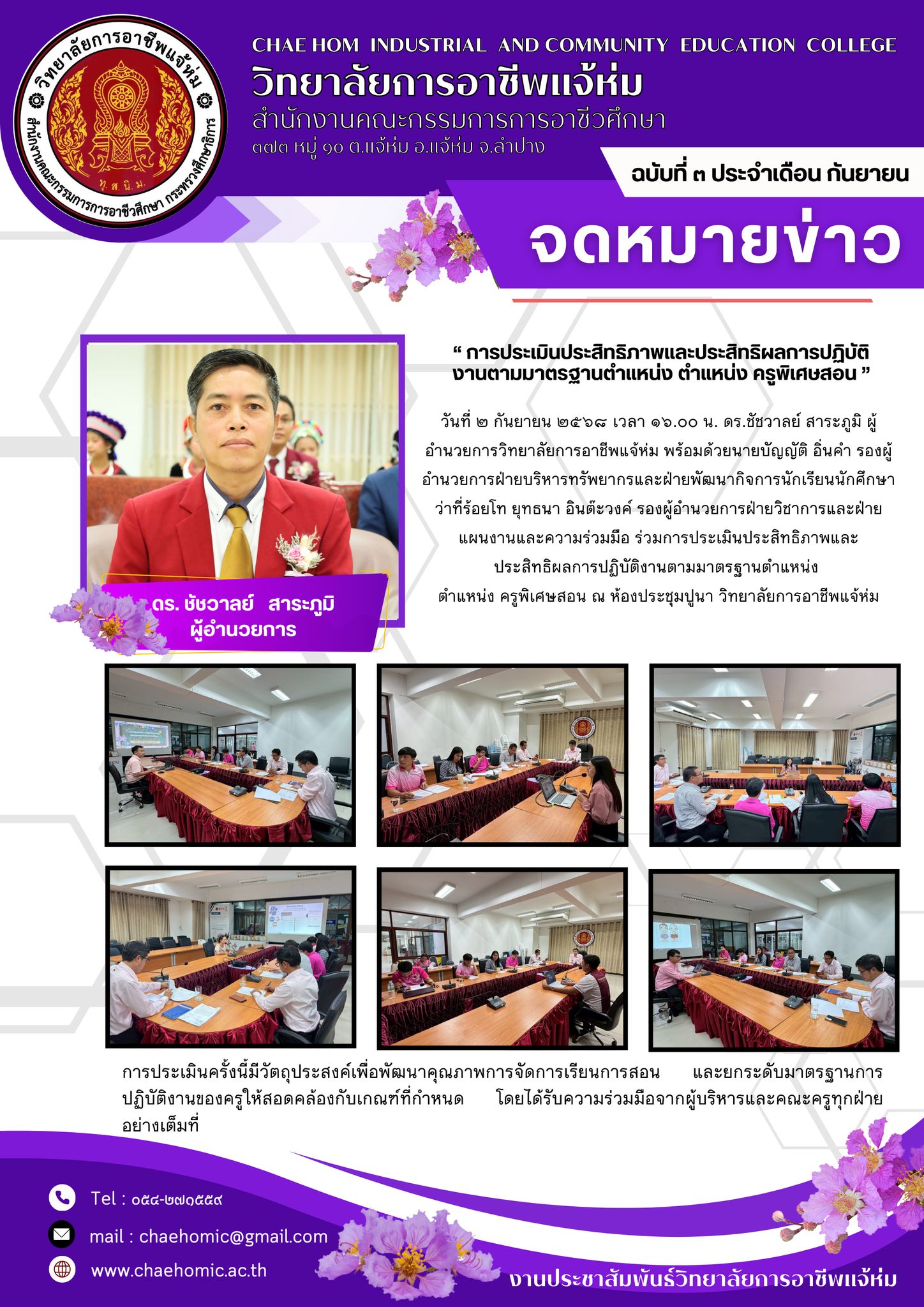 การประเมินประสิทธิภาพและประสิทธิผลการปฏิบัติงานตามมาตรฐานตำแหน่ง ตำแหน่ง ครูพิเศษสอน ” วันที่ ๒ กันยายน ๒๕๖๘ เวลา ๑๖.๐๐ น. ดร.ชัชวาลย์ สาระภูมิ ผู้อำนวยการวิทยาลัยการอาชีพแจ้ห่ม พร้อมด้วยนายบัญญัติ อิ่นคำ รองผู้อำนวยการฝ่ายบริหารทรัพยากรและฝ่ายพัฒนากิจการนักเรียนนักศึกษา ว่าที่ร้อยโท ยุทธนา อินต๊ะวงค์ รองผู้อำนวยการฝ่ายวิชาการและฝ่ายแผนงานและความร่วมมือ ร่วมการประเมินประสิทธิภาพและประสิทธิผลการปฏิบัติงานตามมาตรฐานตำแหน่ง ตำแหน่ง ครูพิเศษสอน ณ ห้องประชุมปูนา วิทยาลัยการอาชีพแจ้ห่ม การประเมินครั้งนี้มีวัตถุประสงค์เพื่อพัฒนาคุณภาพการจัดการเรียนการสอน และยกระดับมาตรฐานการปฏิบัติงานของครูให้สอดคล้องกับเกณฑ์ที่กำหนด โดยได้รับความร่วมมือจากผู้บริหารและคณะครูทุกฝ่ายอย่างเต็มที่