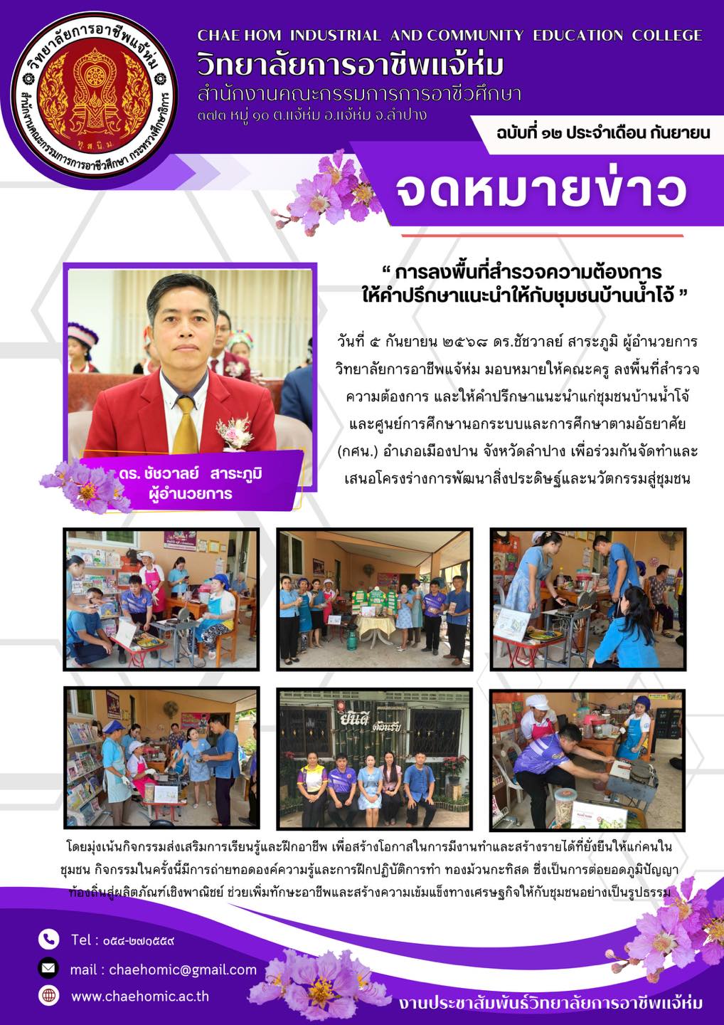 วันที่ ๕ กันยายน ๒๕๖๘ ดร.ชัชวาลย์ สาระภูมิ ผู้อำนวยการวิทยาลัยการอาชีพแจ้ห่ม มอบหมายให้คณะครู ลงพื้นที่สำรวจความต้องการ และให้คำปรึกษาแนะนำแก่ชุมชนบ้านน้ำโจ้ และศูนย์การศึกษานอกระบบและการศึกษาตามอัธยาศัย (กศน.) อำเภอเมืองปาน จังหวัดลำปาง เพื่อร่วมกันจัดทำและเสนอโครงร่างการพัฒนาสิ่งประดิษฐ์และนวัตกรรมสู่ชุมชน โดยมุ่งเน้นกิจกรรมส่งเสริมการเรียนรู้และฝึกอาชีพ เพื่อสร้างโอกาสในการมีงานทำและสร้างรายได้ที่ยั่งยืนให้แก่คนในชุมชน กิจกรรมในครั้งนี้มีการถ่ายทอดองค์ความรู้และการฝึกปฏิบัติการทำ ทองม้วนกะทิสด ซึ่งเป็นการต่อยอดภูมิปัญญาท้องถิ่นสู่ผลิตภัณฑ์เชิงพาณิชย์ ช่วยเพิ่มทักษะอาชีพและสร้างความเข้มแข็งทางเศรษฐกิจให้กับชุมชนอย่างเป็นรูปธรรม