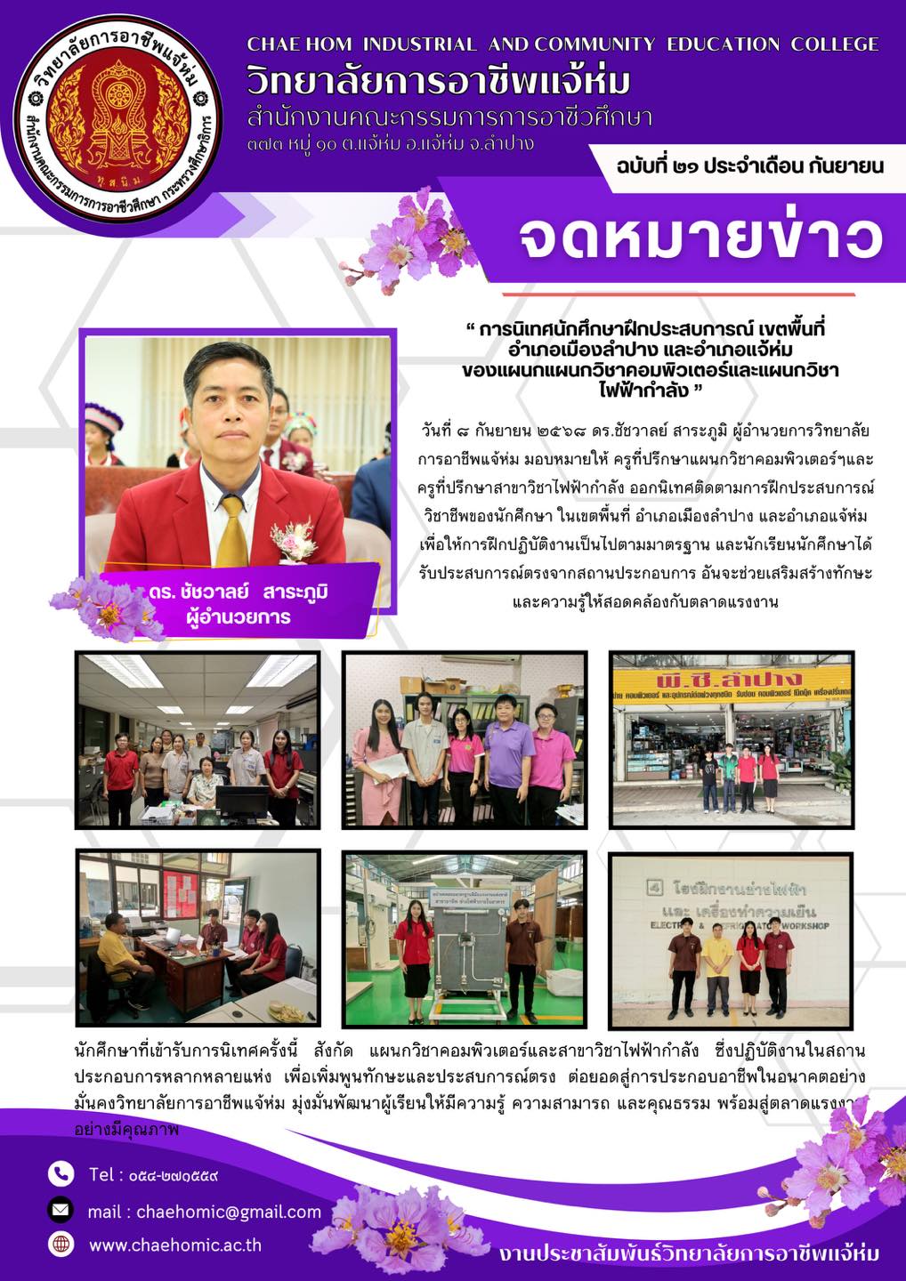 วันที่ ๘ กันยายน ๒๕๖๘ ดร.ชัชวาลย์ สาระภูมิ ผู้อำนวยการวิทยาลัยการอาชีพแจ้ห่ม มอบหมายให้ ครูที่ปรึกษาแผนกวิชาคอมพิวเตอร์ฯและครูที่ปรึกษาสาขาวิชาไฟฟ้ากำลัง ออกนิเทศติดตามการฝึกประสบการณ์วิชาชีพของนักศึกษา ในเขตพื้นที่ อำเภอเมืองลำปาง และอำเภอแจ้ห่ม เพื่อให้การฝึกปฏิบัติงานเป็นไปตามมาตรฐาน และนักเรียนนักศึกษาได้รับประสบการณ์ตรงจากสถานประกอบการ อันจะช่วยเสริมสร้างทักษะและความรู้ให้สอดคล้องกับตลาดแรงงาน