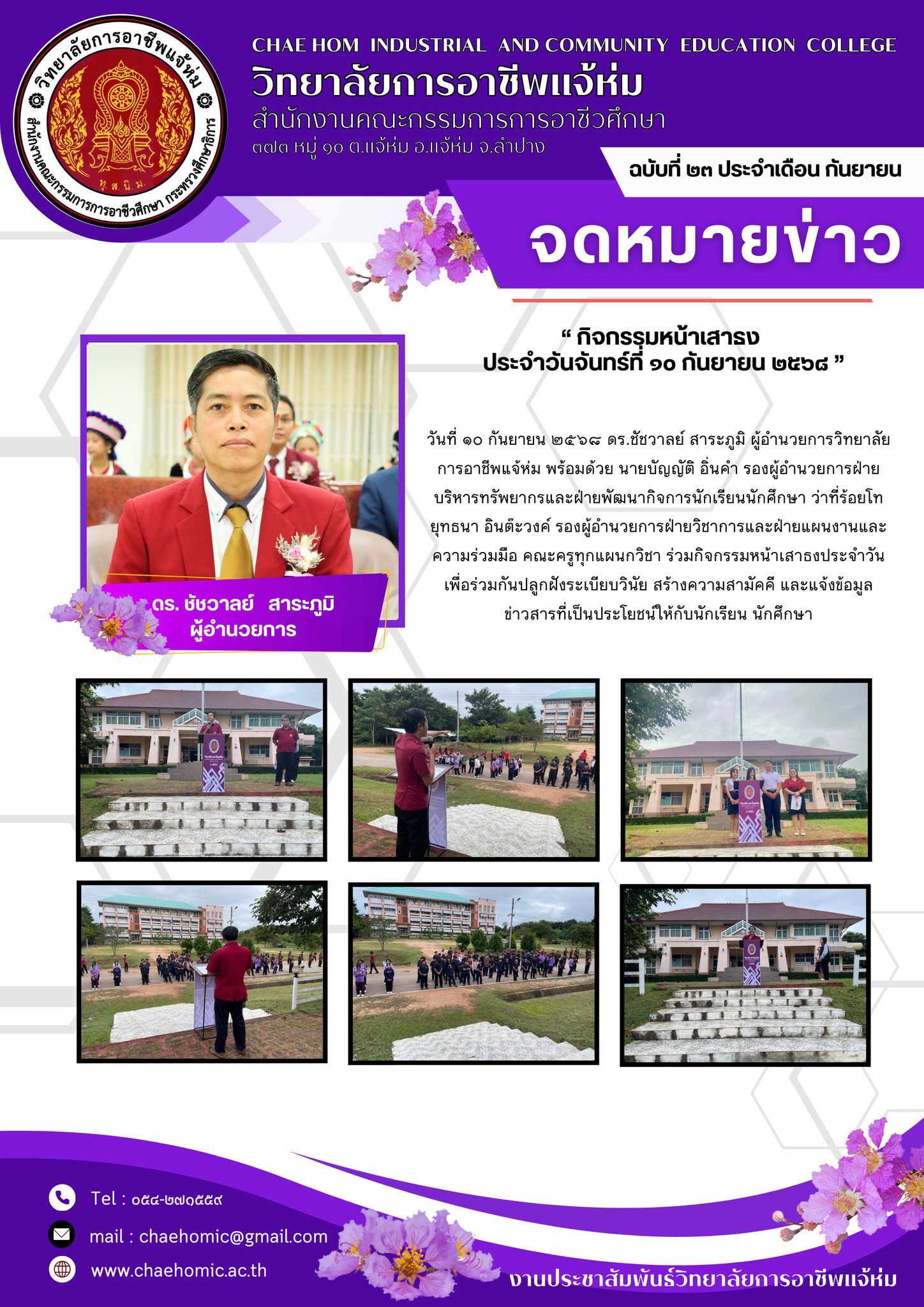 วันที่ ๑๐ กันยายน ๒๕๖๘ ดร.ชัชวาลย์ สาระภูมิ ผู้อำนวยการวิทยาลัยการอาชีพแจ้ห่ม พร้อมด้วย นายบัญญัติ อิ่นคำ รองผู้อำนวยการฝ่ายบริหารทรัพยากรและฝ่ายพัฒนากิจการนักเรียนนักศึกษา ว่าที่ร้อยโท ยุทธนา อินต๊ะวงค์ รองผู้อำนวยการฝ่ายวิชาการและฝ่ายแผนงานและความร่วมมือ คณะครูทุกแผนกวิชา ร่วมกิจกรรมหน้าเสาธงประจำวัน เพื่อร่วมกันปลูกฝังระเบียบวินัย สร้างความสามัคคี และแจ้งข้อมูลข่าวสารที่เป็นประโยชน์ให้กับนักเรียน นักศึกษา