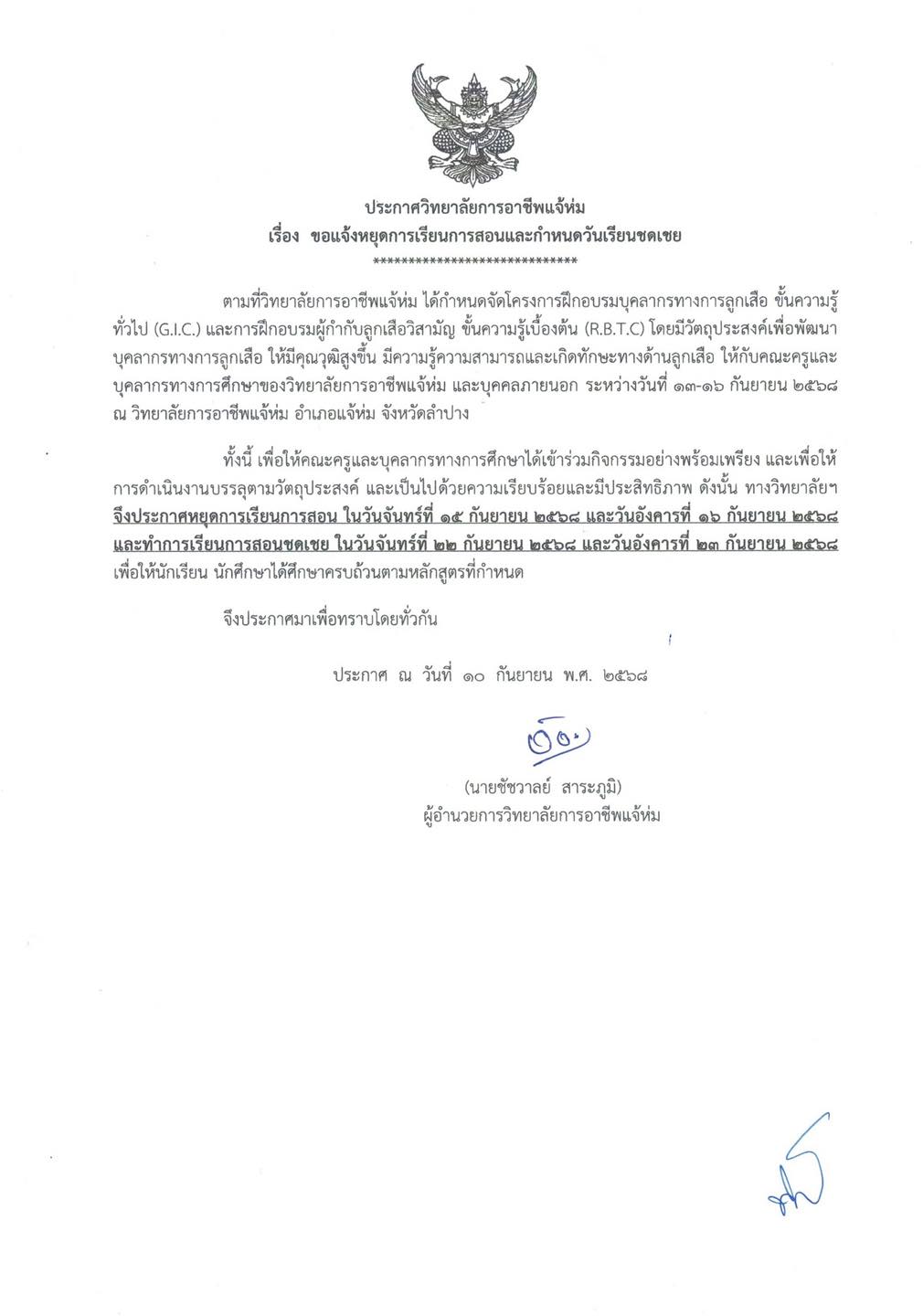 วันจันทร์ที่ 15 กันยายน 2568 และวันอังคารที่ 16 กันยายน 2568 และทำการสอนชดเชยในวันจันทร์ที่ 22 กันยายน 2568 และวันอังคารที่ 23 กันยายน 2568