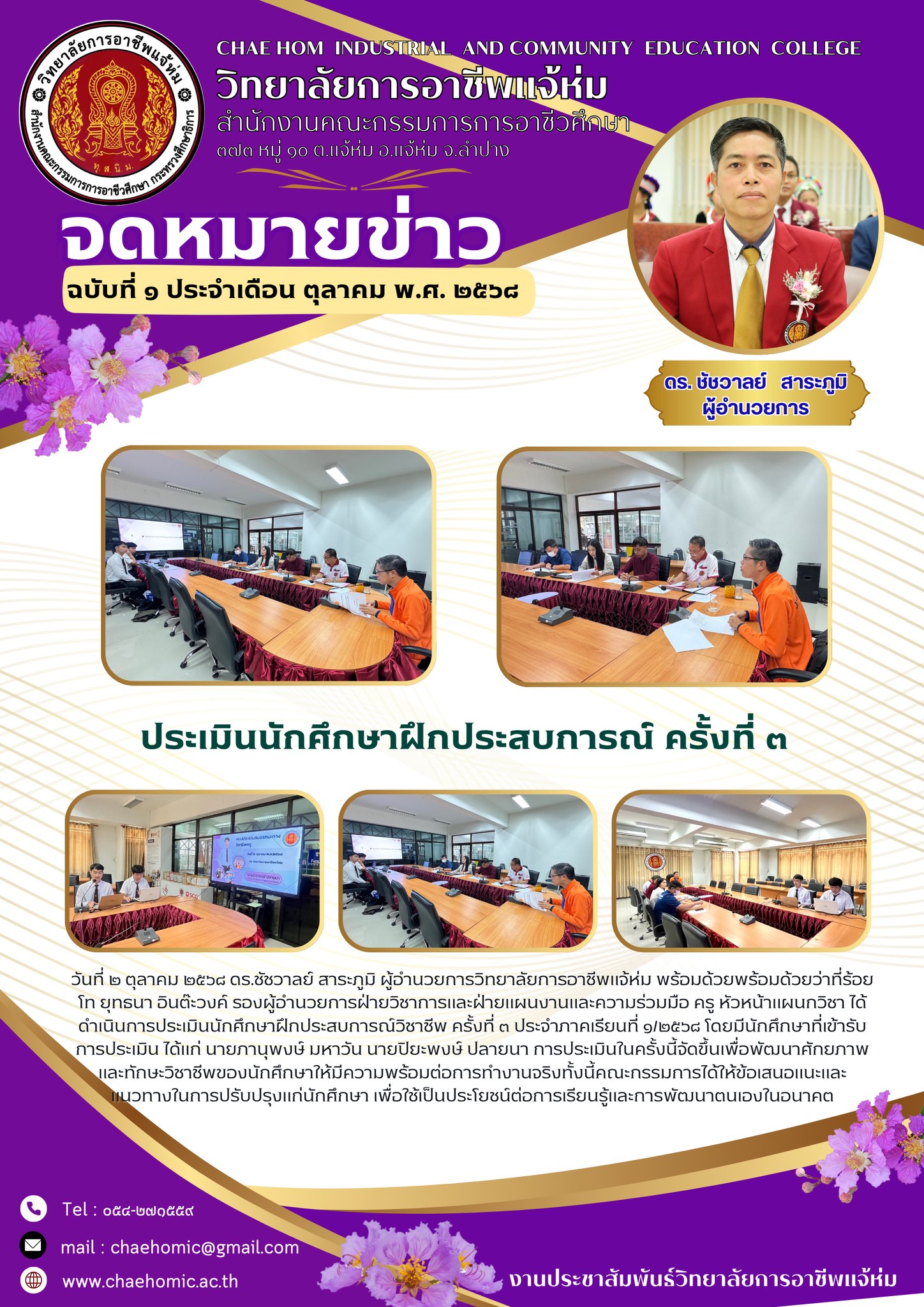 วันที่ ๒ ตุลาคม ๒๕๖๘ ดร.ชัชวาลย์ สาระภูมิ ผู้อำนวยการวิทยาลัยการอาชีพแจ้ห่ม พร้อมด้วยพร้อมด้วยว่าที่ร้อยโท ยุทธนา อินต๊ะวงค์ รองผู้อำนวยการฝ่ายวิชาการและฝ่ายแผนงานและความร่วมมือ ครู หัวหน้าแผนกวิชา ได้ดำเนินการประเมินนักศึกษาฝึกประสบการณ์วิชาชีพ ครั้งที่ ๓ ประจำภาคเรียนที่ ๑/๒๕๖๘ โดยมีนักศึกษาที่เข้ารับการประเมิน ได้แก่ นายภานุพงษ์ มหาวัน นายปิยะพงษ์ ปลายนา การประเมินในครั้งนี้จัดขึ้นเพื่อพัฒนาศักยภาพและทักษะวิชาชีพของนักศึกษาให้มีความพร้อมต่อการทำงานจริงทั้งนี้คณะกรรมการได้ให้ข้อเสนอแนะและแนวทางในการปรับปรุงแก่นักศึกษา เพื่อใช้เป็นประโยชน์ต่อการเรียนรู้และการพัฒนาตนเองในอนาคต