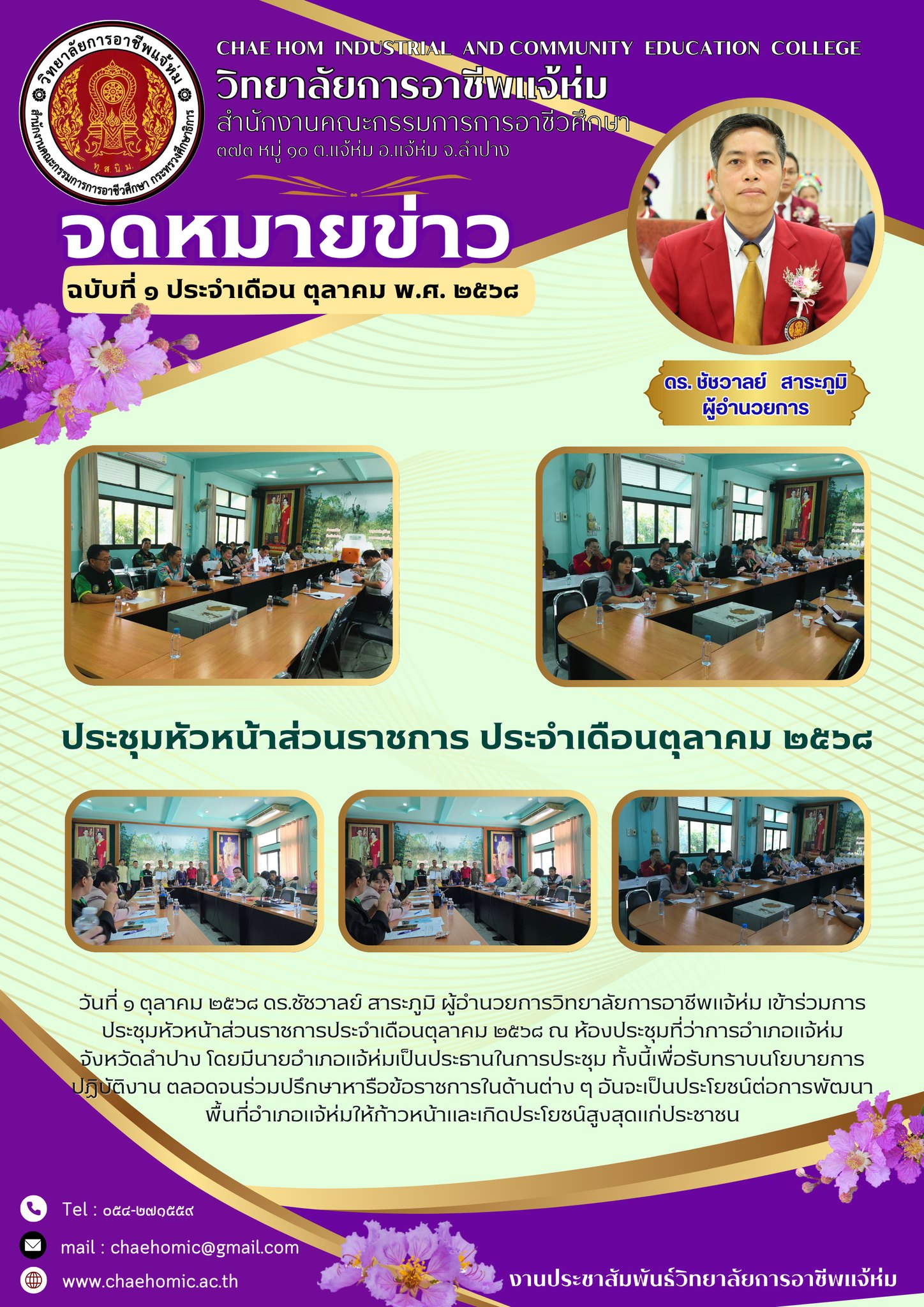 วันที่ ๑ ตุลาคม ๒๕๖๘ ดร.ชัชวาลย์ สาระภูมิ ผู้อำนวยการวิทยาลัยการอาชีพแจ้ห่ม เข้าร่วมการประชุมหัวหน้าส่วนราชการประจำเดือนตุลาคม ๒๕๖๘ ณ ห้องประชุมที่ว่าการอำเภอแจ้ห่ม จังหวัดลำปาง โดยมีนายอำเภอแจ้ห่มเป็นประธานในการประชุม ทั้งนี้เพื่อรับทราบนโยบายการปฏิบัติงาน ตลอดจนร่วมปรึกษาหารือข้อราชการในด้านต่าง ๆ อันจะเป็นประโยชน์ต่อการพัฒนาพื้นที่อำเภอแจ้ห่มให้ก้าวหน้าและเกิดประโยชน์สูงสุดแก่ประชาชน