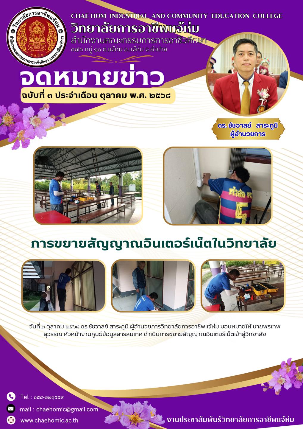 นที่ ๓ ตุลาคม ๒๕๖๘ ดร.ชัชวาลย์ สาระภูมิ ผู้อำนวยการวิทยาลัยการอาชีพแจ้ห่ม มอบหมายให้ นายพรเทพ สุวรรณ หัวหน้างานศูนย์ข้อมูลสารสนเทศ ดำเนินการขยายสัญญาณอินเตอร์เน็ตเข้าสู่วิทยาลัย