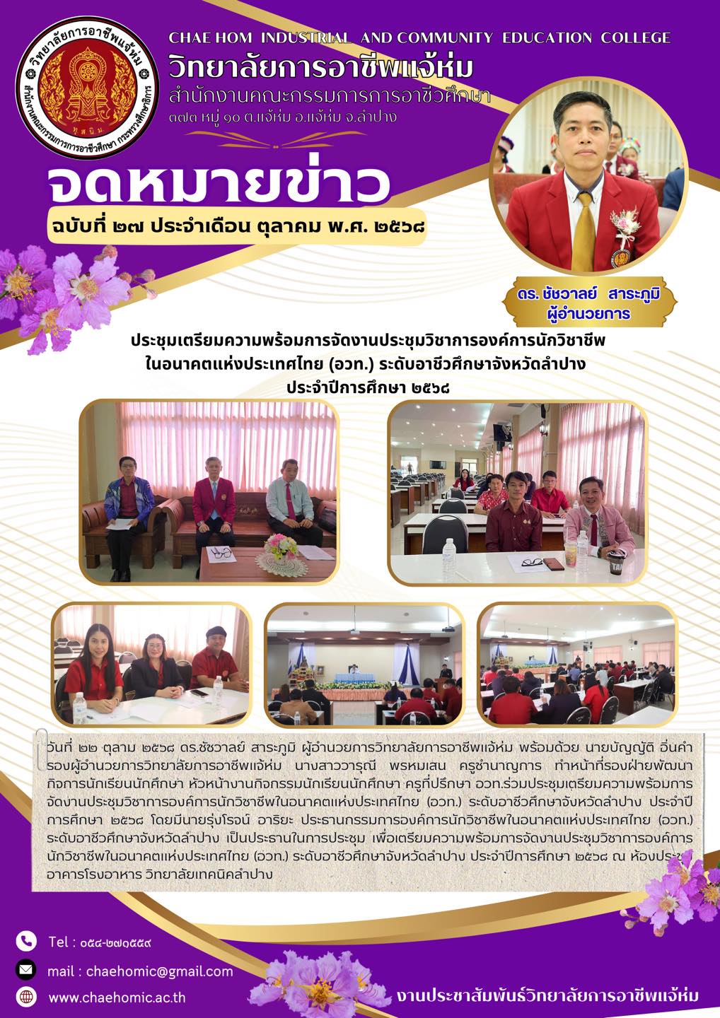 วันที่ ๒๒ ตุลาม ๒๕๖๘ ดร.ชัชวาลย์ สาระภูมิ ผู้อำนวยการวิทยาลัยการอาชีพแจ้ห่ม พร้อมด้วย นายบัญญัติ อิ่นคำ รองผู้อำนวยการวิทยาลัยการอาชีพแจ้ห่ม นางสาววารุณี พรหมเสน ครูชำนาญการ ทำหน้าที่รองฝ่ายพัฒนากิจการนักเรียนนักศึกษา หัวหน้างานกิจกรรมนักเรียนนักศึกษา ครูที่ปรึกษา อวท.ร่วมประชุมเตรียมความพร้อมการจัดงานประชุมวิชาการองค์การนักวิชาชีพในอนาคตแห่งประเทศไทย (อวท.) ระดับอาชีวศึกษาจังหวัดลำปาง ประจำปีการศึกษา ๒๕๖๘ โดยมีนายรุ่งโรจน์ อาริยะ ประธานกรรมการองค์การนักวิชาชีพในอนาคตแห่งประเทศไทย (อวท.) ระดับอาชีวศึกษาจังหวัดลำปาง เป็นประธานในการประชุม เพื่อเตรียมความพร้อมการจัดงานประชุมวิชาการองค์การ นักวิชาชีพในอนาคตแห่งประเทศไทย (อวท.) ระดับอาชีวศึกษาจังหวัดลำปาง ประจำปีการศึกษา ๒๕๖๘ ณ ห้องประชุม อาคารโรงอาหาร วิทยาลัยเทคนิคลำปาง