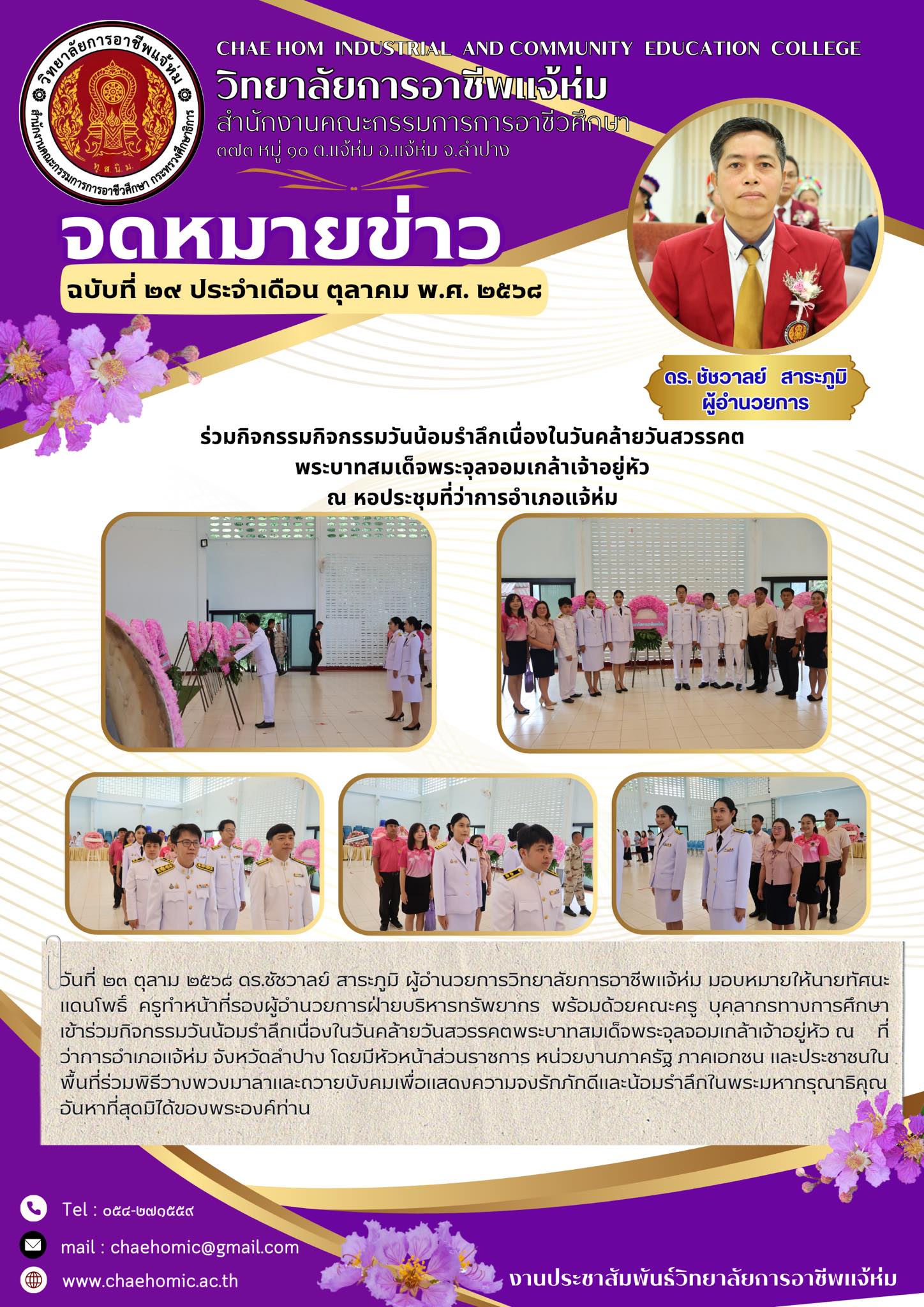 วันที่ ๒๓ ตุลาม ๒๕๖๘ ดร.ชัชวาลย์ สาระภูมิ ผู้อำนวยการวิทยาลัยการอาชีพแจ้ห่ม มอบหมายให้นายทัศนะ แดนโพธิ์ ครูทำหน้าที่รองผู้อำนวยการฝ่ายบริหารทรัพยากร พร้อมด้วยคณะครู บุคลากรทางการศึกษา เข้าร่วมกิจกรรมวันน้อมรำลึกเนื่องในวันคล้ายวันสวรรคตพระบาทสมเด็จพระจุลจอมเกล้าเจ้าอยู่หัว ณ ที่ว่าการอำเภอแจ้ห่ม จังหวัดลำปาง โดยมีหัวหน้าส่วนราชการ หน่วยงานภาครัฐ ภาคเอกชน และประชาชนในพื้นที่ร่วมพิธีวางพวงมาลาและถวายบังคมเพื่อแสดงความจงรักภักดีและน้อมรำลึกในพระมหากรุณาธิคุณอันหาที่สุดมิได้ของพระองค์ท่าน
