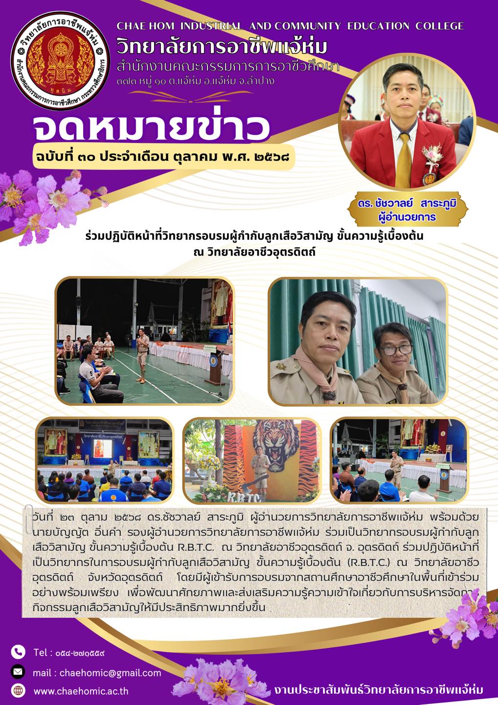 วันที่ ๒๓ ตุลาม ๒๕๖๘ ดร.ชัชวาลย์ สาระภูมิ ผู้อำนวยการวิทยาลัยการอาชีพแจ้ห่ม พร้อมด้วย นายบัญญัต อิ่นคำ รองผู้อำนวยการวิทยาลัยการอาชีพแจ้ห่ม ร่วมเป็นวิทยากรอบรมผู้กำกับลูกเสือวิสามัญ ขั้นความรู้เบื้องต้น R.B.T.C. ณ วิทยาลัยอาชีวอุตรดิตถ์ จ. อุตรดิตถ์ ร่วมปฏิบัติหน้าที่เป็นวิทยากรในการอบรมผู้กำกับลูกเสือวิสามัญ ขั้นความรู้เบื้องต้น (R.B.T.C.) ณ วิทยาลัยอาชีวอุตรดิตถ์ จังหวัดอุตรดิตถ์ โดยมีผู้เข้ารับการอบรมจากสถานศึกษาอาชีวศึกษาในพื้นที่เข้าร่วมอย่างพร้อมเพรียง เพื่อพัฒนาศักยภาพและส่งเสริมความรู้ความเข้าใจเกี่ยวกับการบริหารจัดการกิจกรรมลูกเสือวิสามัญให้มีประสิทธิภาพมากยิ่งขึ้น