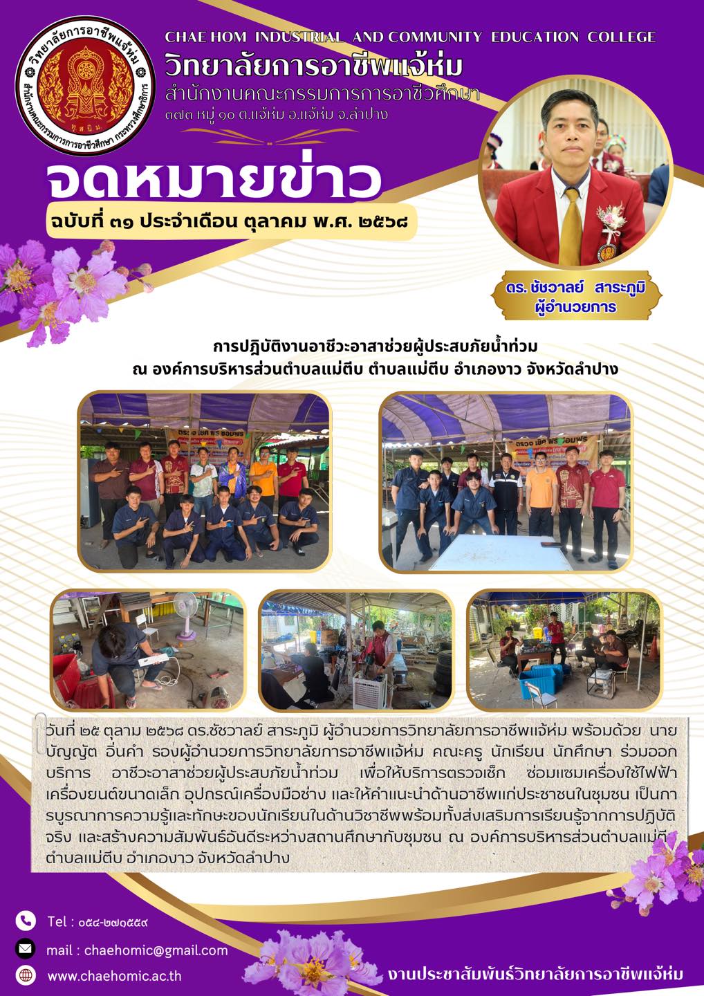 วันที่ ๒๕ ตุลาม ๒๕๖๘ ดร.ชัชวาลย์ สาระภูมิ ผู้อำนวยการวิทยาลัยการอาชีพแจ้ห่ม พร้อมด้วย นายบัญญัต อิ่นคำ รองผู้อำนวยการวิทยาลัยการอาชีพแจ้ห่ม คณะครู นักเรียน นักศึกษา ร่วมออกบริการ อาชีวะอาสาช่วยผู้ประสบภัยน้ำท่วม เพื่อให้บริการตรวจเช็ก ซ่อมแซมเครื่องใช้ไฟฟ้า เครื่องยนต์ขนาดเล็ก อุปกรณ์เครื่องมือช่าง และให้คำแนะนำด้านอาชีพแก่ประชาชนในชุมชน เป็นการบูรณาการความรู้และทักษะของนักเรียนในด้านวิชาชีพพร้อมทั้งส่งเสริมการเรียนรู้จากการปฏิบัติจริง และสร้างความสัมพันธ์อันดีระหว่างสถานศึกษากับชุมชน ณ องค์การบริหารส่วนตำบลแม่ตีบ ตำบลแม่ตีบ อำเภองาว จังหวัดลำปาง