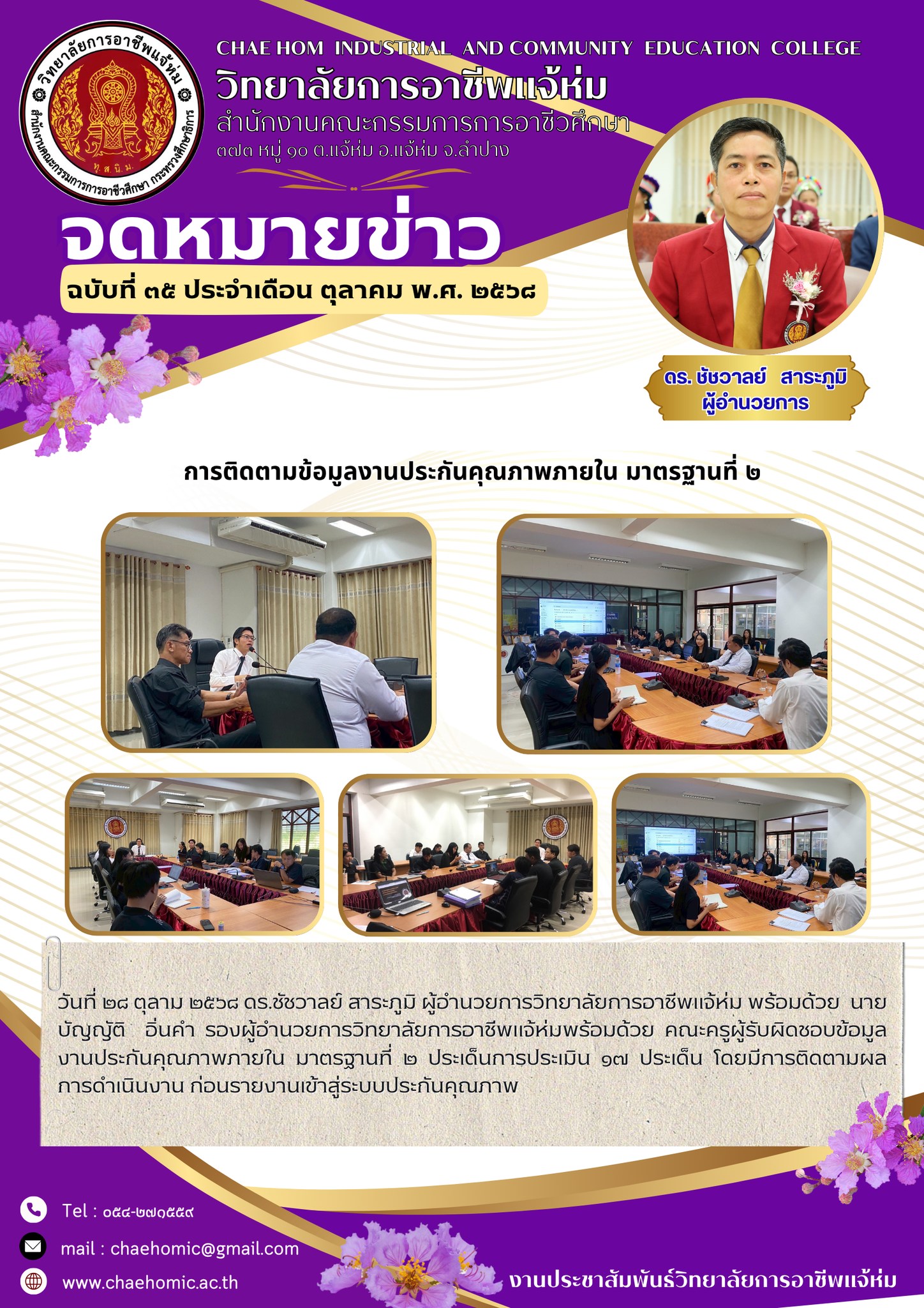 วันที่ ๒๘ ตุลาม ๒๕๖๘ ดร.ชัชวาลย์ สาระภูมิ ผู้อำนวยการวิทยาลัยการอาชีพแจ้ห่ม พร้อมด้วย นายบัญญัติ อิ่นคำ รองผู้อำนวยการวิทยาลัยการอาชีพแจ้ห่มพร้อมด้วย คณะครูผู้รับผิดชอบข้อมูลงานประกันคุณภาพภายใน มาตรฐานที่ ๒ ประเด็นการประเมิน ๑๗ ประเด็น โดยมีการติดตามผลการดำเนินงาน ก่อนรายงานเข้าสู่ระบบประกันคุณภาพ