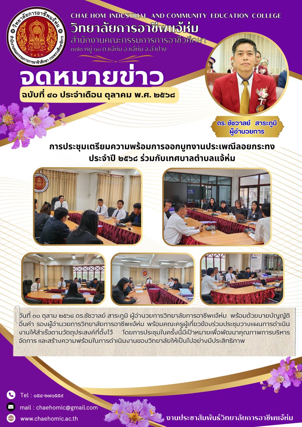วันที่ ๓๐ ตุลาม ๒๕๖๘ ดร.ชัชวาลย์ สาระภูมิ ผู้อำนวยการวิทยาลัยการอาชีพแจ้ห่ม พร้อมด้วยนายบัญญัติ อิ่นคำ รองผํู้อำนวยการวิทยาลัยการอาชีพแจ้ห่ม พร้อมคณะครูผู้เกี่ยวข้องร่วมประชุมวางแผนการดำเนินงานให้สำเร็จตามวัตถุประสงค์ที่ตั้งไว้ โดยการประชุมในครั้งนี้มีเป้าหมายเพื่อพัฒนาคุณภาพการบริหารจัดการ และสร้างความพร้อมในการดำเนินงานของวิทยาลัยให้เป็นไปอย่างมีประสิทธิภาพ