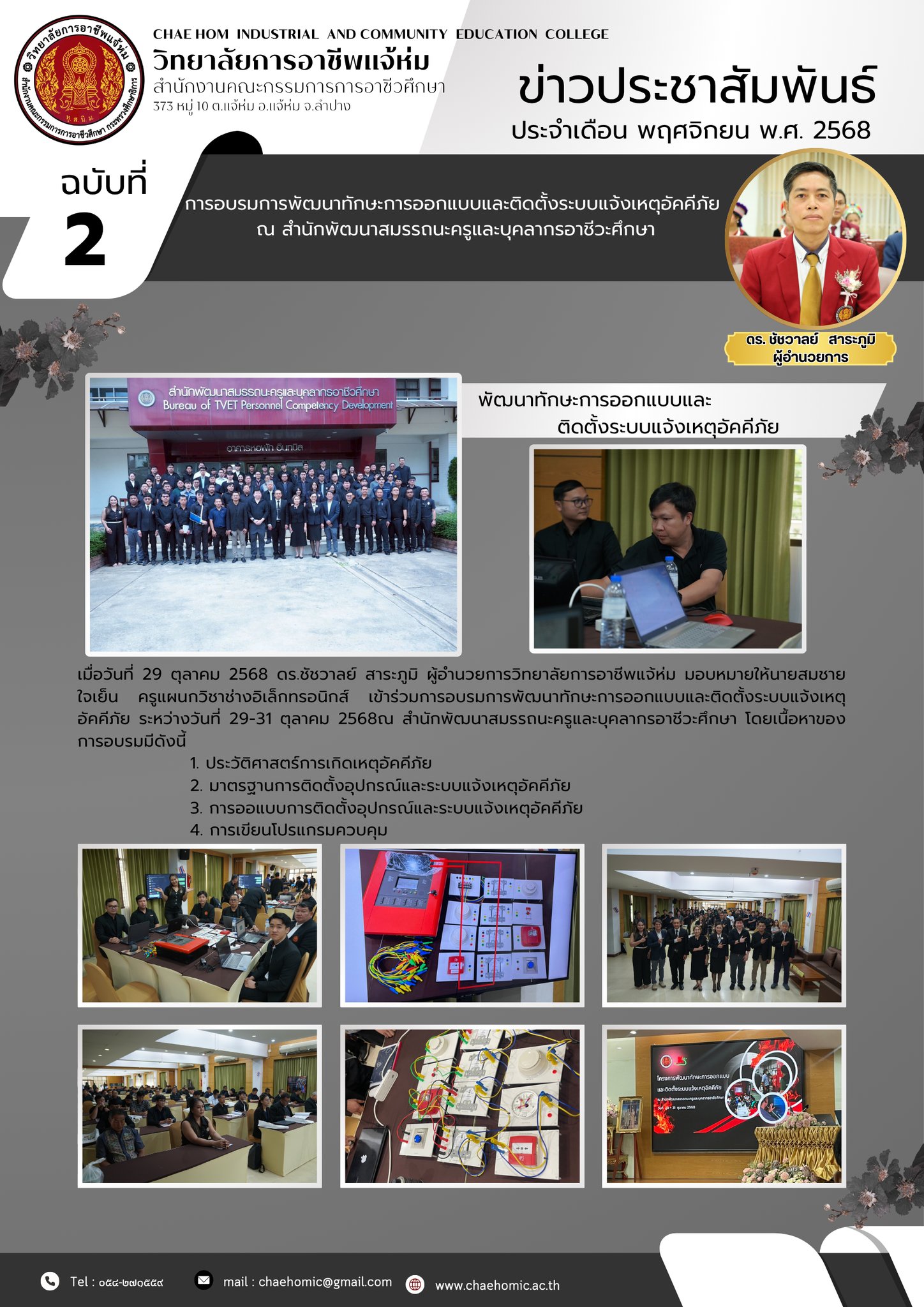 เมื่อวันที่ 29 ตุลาคม 2568 ดร.ชัชวาลย์ สาระภูมิ ผู้อำนวยการวิทยาลัยการอาชีพแจ้ห่ม มอบหมายให้นายสมชาย ใจเย็น ครูแผนกวิชาช่างอิเล็กทรอนิกส์ เข้าร่วมการอบรมการพัฒนาทักษะการออกแบบและติดตั้งระบบแจ้งเหตุอัคคีภัย ระหว่างวันที่ 29-31 ตุลาคม 2568ณ สำนักพัฒนาสมรรถนะครูและบุคลากรอาชีวะศึกษา โดยเนื้อหาของการอบรมมีดังนี้