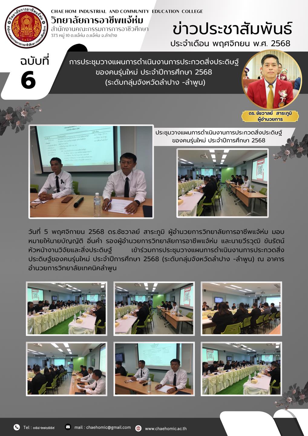 วันที่ 5 พฤศจิกายน 2568 ดร.ชัชวาลย์ สาระภูมิ ผู้อำนวยการวิทยาลัยการอาชีพแจ้ห่ม มอบหมายให้นายบัญญัติ อิ่นคำ รองผู้อำนวยการวิทยาลัยการอาชีพแจ้ห่ม และนายวีรวุฒิ ขันรัตน์ หัวหน้างานวิจัยและสิ่งประดิษฐ์ เข้าร่วมการประชุมวางแผนการดำเนินงานการประกวดสิ่งประดิษฐ์ของคนรุ่นใหม่ ประจำปีการศึกษา 2568 (ระดับกลุ่มจังหวัดลำปาง -ลำพูน) ณ อาคารอำนวยการวิทยาลัยเทคนิคลำพูน