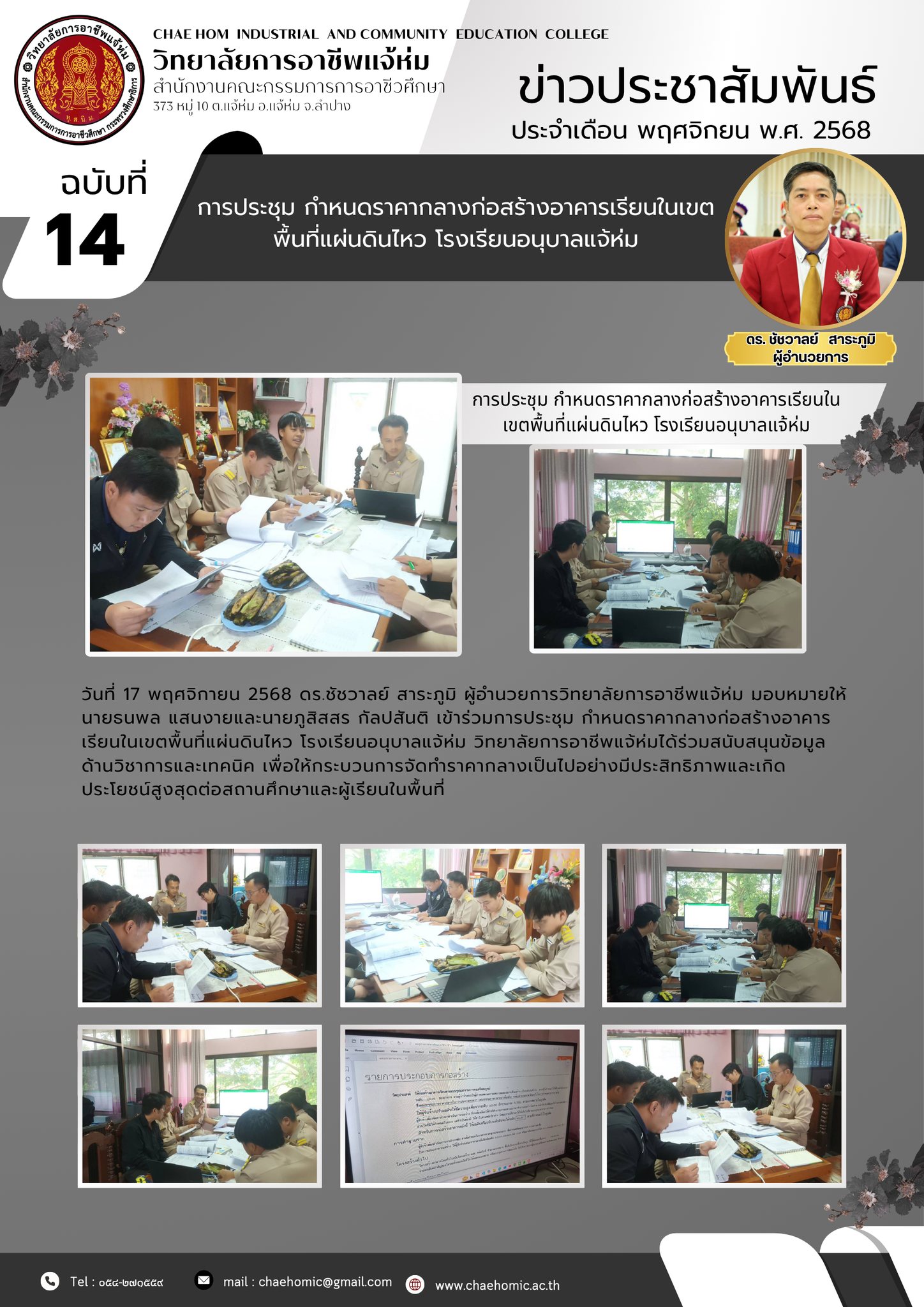 วันที่ 17 พฤศจิกายน 2568 ดร.ชัชวาลย์ สาระภูมิ ผู้อำนวยการวิทยาลัยการอาชีพแจ้ห่ม มอบหมายให้นายธนพล แสนงายและนายภูสิสสร กัลปสันติ เข้าร่วมการประชุม กำหนดราคากลางก่อสร้างอาคารเรียนในเขตพื้นที่แผ่นดินไหว โรงเรียนอนุบาลแจ้ห่ม วิทยาลัยการอาชีพแจ้ห่มได้ร่วมสนับสนุนข้อมูลด้านวิชาการและเทคนิค เพื่อให้กระบวนการจัดทำราคากลางเป็นไปอย่างมีประสิทธิภาพและเกิดประโยชน์สูงสุดต่อสถานศึกษาและผู้เรียนในพื้นที่