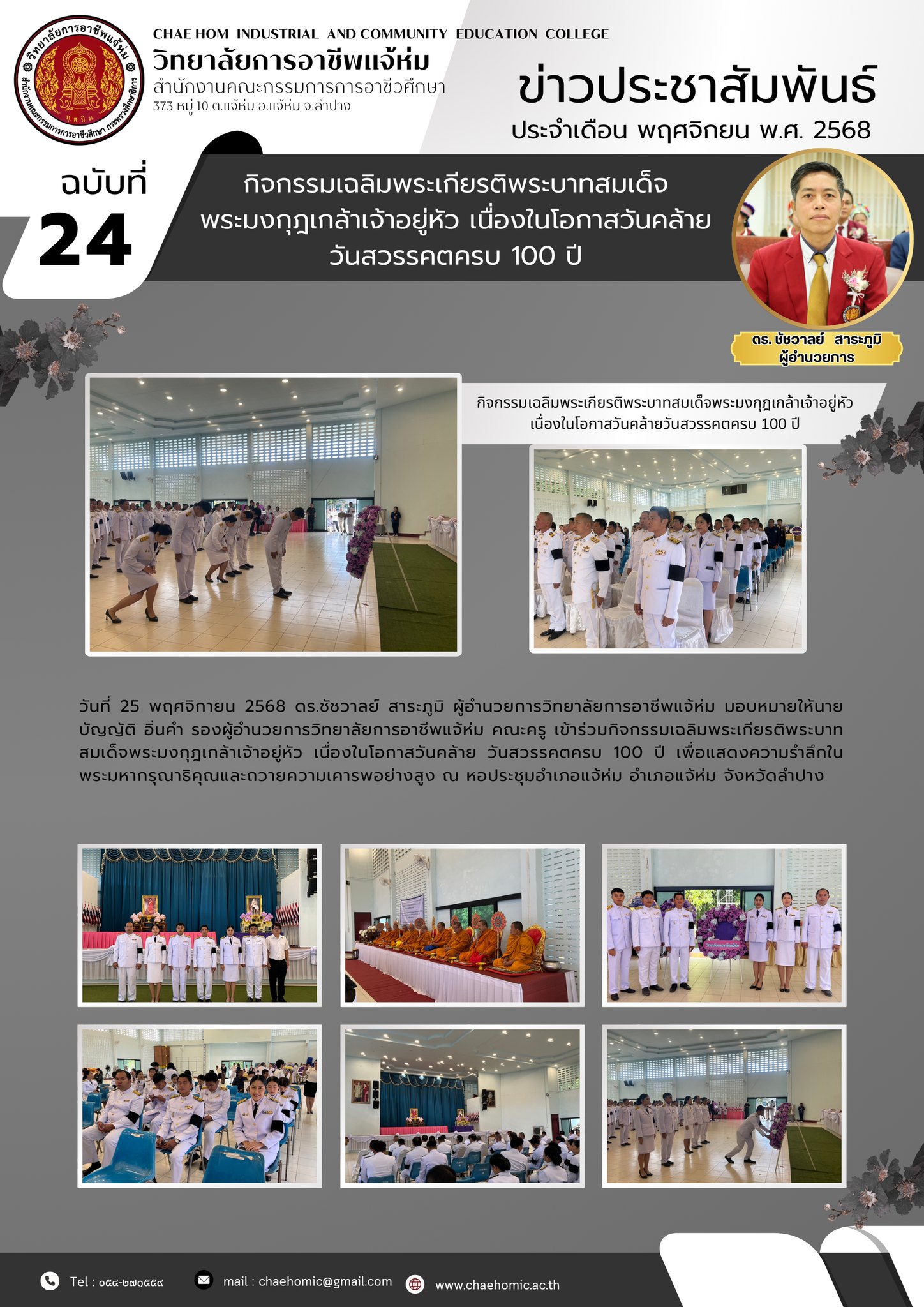 วันที่ 25 พฤศจิกายน 2568 ดร.ชัชวาลย์ สาระภูมิ ผู้อำนวยการวิทยาลัยการอาชีพแจ้ห่ม มอบหมายให้นายบัญญัติ อิ่นคำ รองผู้อำนวยการวิทยาลัยการอาชีพแจ้ห่ม คณะครู เข้าร่วมกิจกรรมเฉลิมพระเกียรติพระบาทสมเด็จพระมงกุฎเกล้าเจ้าอยู่หัว เนื่องในโอกาสวันคล้าย วันสวรรคตครบ 100 ปี เพื่อแสดงความรำลึกในพระมหากรุณาธิคุณและถวายความเคารพอย่างสูง ณ หอประชุมอำเภอแจ้ห่ม อำเภอแจ้ห่ม จังหวัดลำปาง