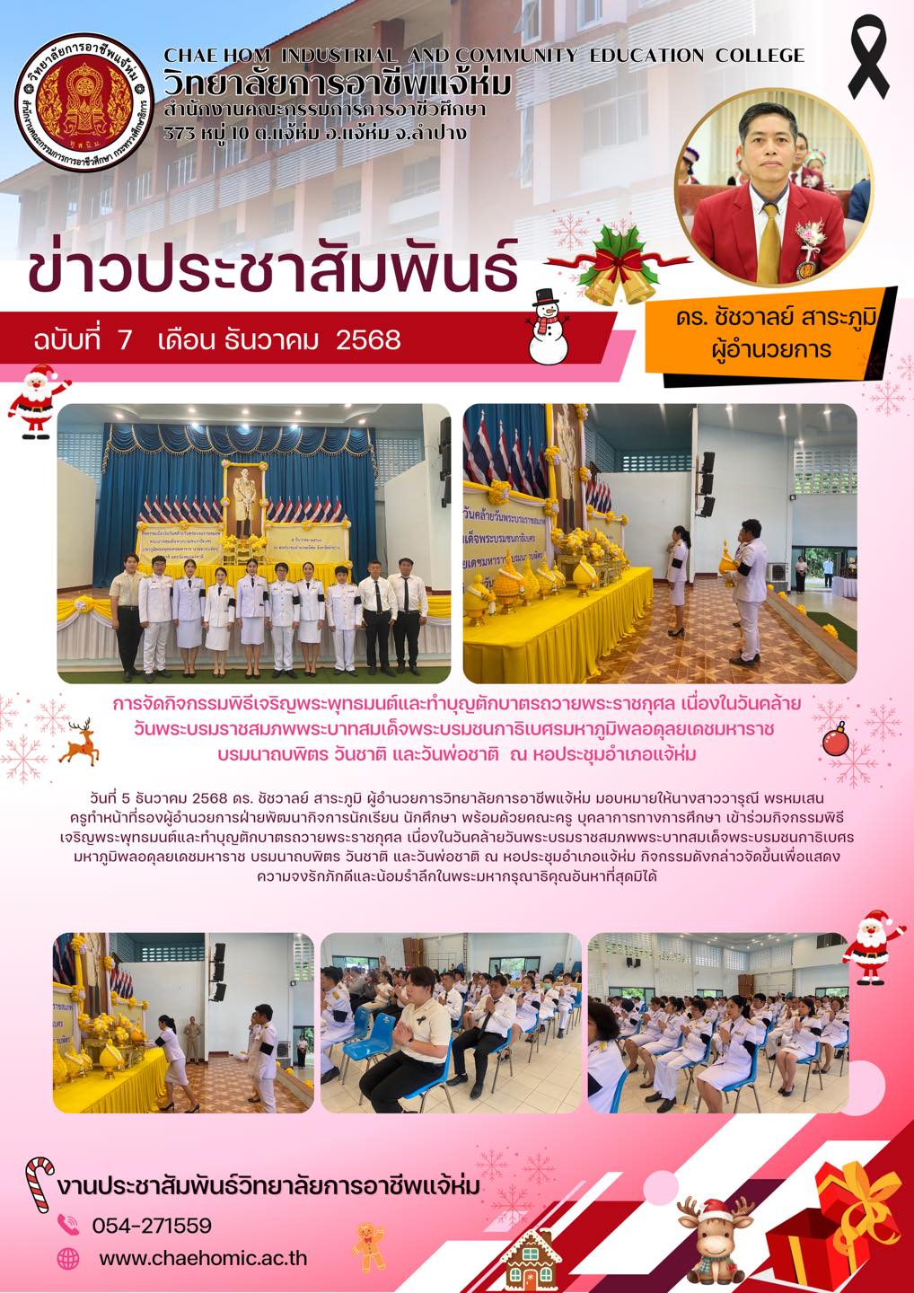 วันที่ 5 ธันวาคม 2568 ดร. ชัชวาลย์ สาระภูมิ ผู้อำนวยการวิทยาลัยการอาชีพแจ้ห่ม มอบหมายให้นางสาววารุณี พรหมเสน ครูทำหน้าที่รองผู้อำนวยการฝ่ายพัฒนากิจการนักเรียน นักศึกษา พร้อมด้วยคณะครู บุคลาการทางการศึกษา เข้าร่วมกิจกรรมพิธีเจริญพระพุทธมนต์และทำบุญตักบาตรถวายพระราชกุศล เนื่องในวันคล้ายวันพระบรมราชสมภพพระบาทสมเด็จพระบรมชนกาธิเบศรมหาภูมิพลอดุลยเดชมหาราช บรมนาถบพิตร วันชาติ และวันพ่อชาติ ณ หอประชุมอำเภอแจ้ห่ม กิจกรรมดังกล่าวจัดขึ้นเพื่อแสดงความจงรักภักดีและน้อมรำลึกในพระมหากรุณาธิคุณอันหาที่สุดมิได้
