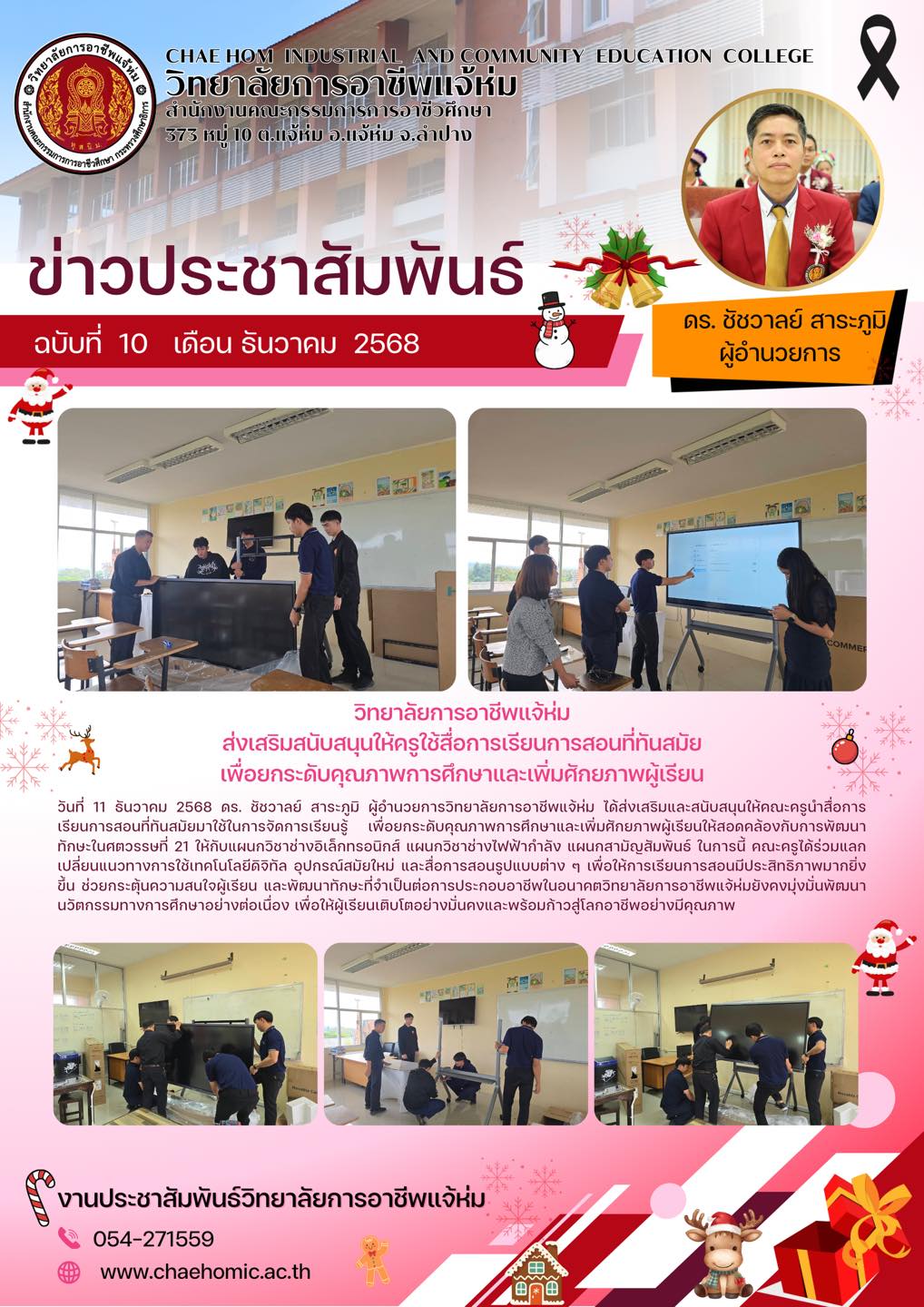 วันที่ 11 ธันวาคม 2568 ดร. ชัชวาลย์ สาระภูมิ ผู้อำนวยการวิทยาลัยการอาชีพแจ้ห่ม ได้ส่งเสริมและสนับสนุนให้คณะครูนำสื่อการเรียนการสอนที่ทันสมัยมาใช้ในการจัดการเรียนรู้ เพื่อยกระดับคุณภาพการศึกษาและเพิ่มศักยภาพผู้เรียนให้สอดคล้องกับการพัฒนาทักษะในศตวรรษที่ 21 ในการติดตั้งจอขนาด 75 นิ้วให้กับแผนกวิชาช่างอิเล็กทรอนิกส์ แผนกวิชาช่างไฟฟ้ากำลัง แผนกสามัญสัมพันธ์ ในการนี้ คณะครูได้ร่วมแลกเปลี่ยนแนวทางการใช้เทคโนโลยีดิจิทัล อุปกรณ์สมัยใหม่ และสื่อการสอนรูปแบบต่าง ๆ เพื่อให้การเรียนการสอนมีประสิทธิภาพมากยิ่งขึ้น ช่วยกระตุ้นความสนใจผู้เรียน และพัฒนาทักษะที่จำเป็นต่อการประกอบอาชีพในอนาคตวิทยาลัยการอาชีพแจ้ห่มยังคงมุ่งมั่นพัฒนานวัตกรรมทางการศึกษาอย่างต่อเนื่อง เพื่อให้ผู้เรียนเติบโตอย่างมั่นคงและพร้อมก้าวสู่โลกอาชีพอย่างมีคุณภาพ