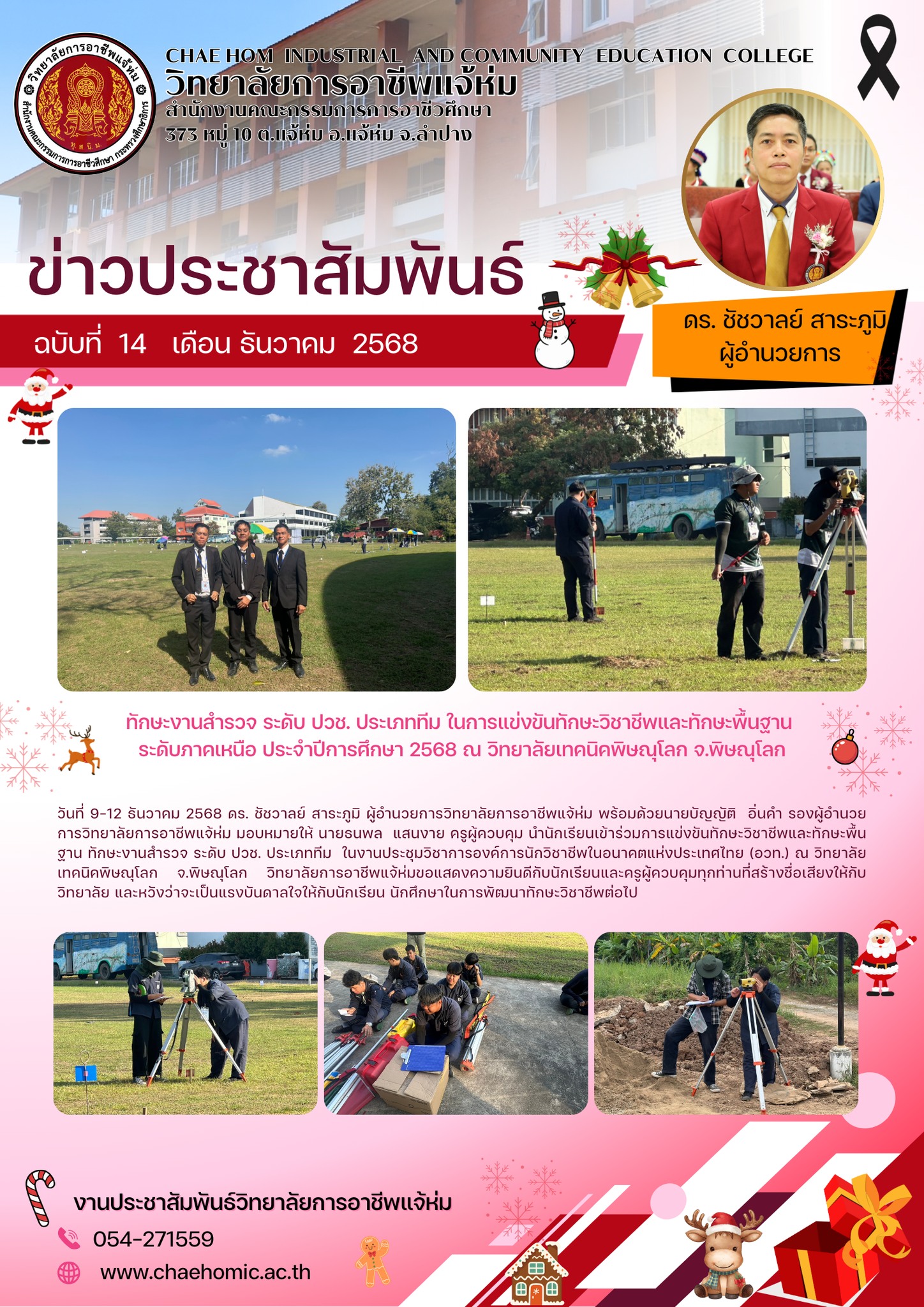 วันที่ 9-12 ธันวาคม 2568 ดร. ชัชวาลย์ สาระภูมิ ผู้อำนวยการวิทยาลัยการอาชีพแจ้ห่ม พร้อมด้วยนายบัญญัติ อิ่นคำ รองผู้อำนวยการวิทยาลัยการอาชีพแจ้ห่ม มอบหมายให้ นายธนพล แสนงาย ครูผู้ควบคุม นำนักเรียนเข้าร่วมการแข่งขันทักษะวิชาชีพและทักษะพื้นฐาน ทักษะงานสำรวจ ระดับ ปวช. ประเภททีม ในงานประชุมวิชาการองค์การนักวิชาชีพในอนาคตแห่งประเทศไทย (อวท.) ณ วิทยาลัยเทคนิคพิษณุโลก จ.พิษณุโลก วิทยาลัยการอาชีพแจ้ห่มขอแสดงความยินดีกับนักเรียนและครูผู้ควบคุมทุกท่านที่สร้างชื่อเสียงให้กับวิทยาลัย และหวังว่าจะเป็นแรงบันดาลใจให้กับนักเรียน นักศึกษาในการพัฒนาทักษะวิชาชีพต่อไป
