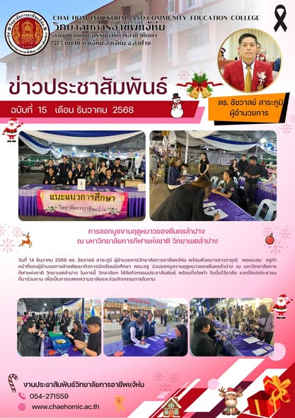 วันที่ 14 ธันวาคม 2568 ดร. ชัชวาลย์ สาระภูมิ ผู้อำนวยการวิทยาลัยการอาชีพแจ้ห่ม พร้อมด้วยนางสาววารุณี พรหมเสน ครูทำหน้าที่รองผู้อำนวยการฝ่ายพัฒนากิจการนักเรียนนักศึกษา คณะครู ร่วมออกบูธงานฤดูหนาวของดีนครลำปาง ณ มหาวิทยาลัยการกีฬาแห่งชาติ วิทยาเขตลำปาง ในการนี้ วิทยาลัยฯ ได้จัดกิจกรรมประชาสัมพันธ์ พร้อมทั้งจัดทำ ริบบิ้นไว้อาลัย แจกให้แก่ประชาชนที่มาร่วมงาน เพื่อเป็นการแสดงความอาลัยและร่วมกิจกรรมภายในงาน