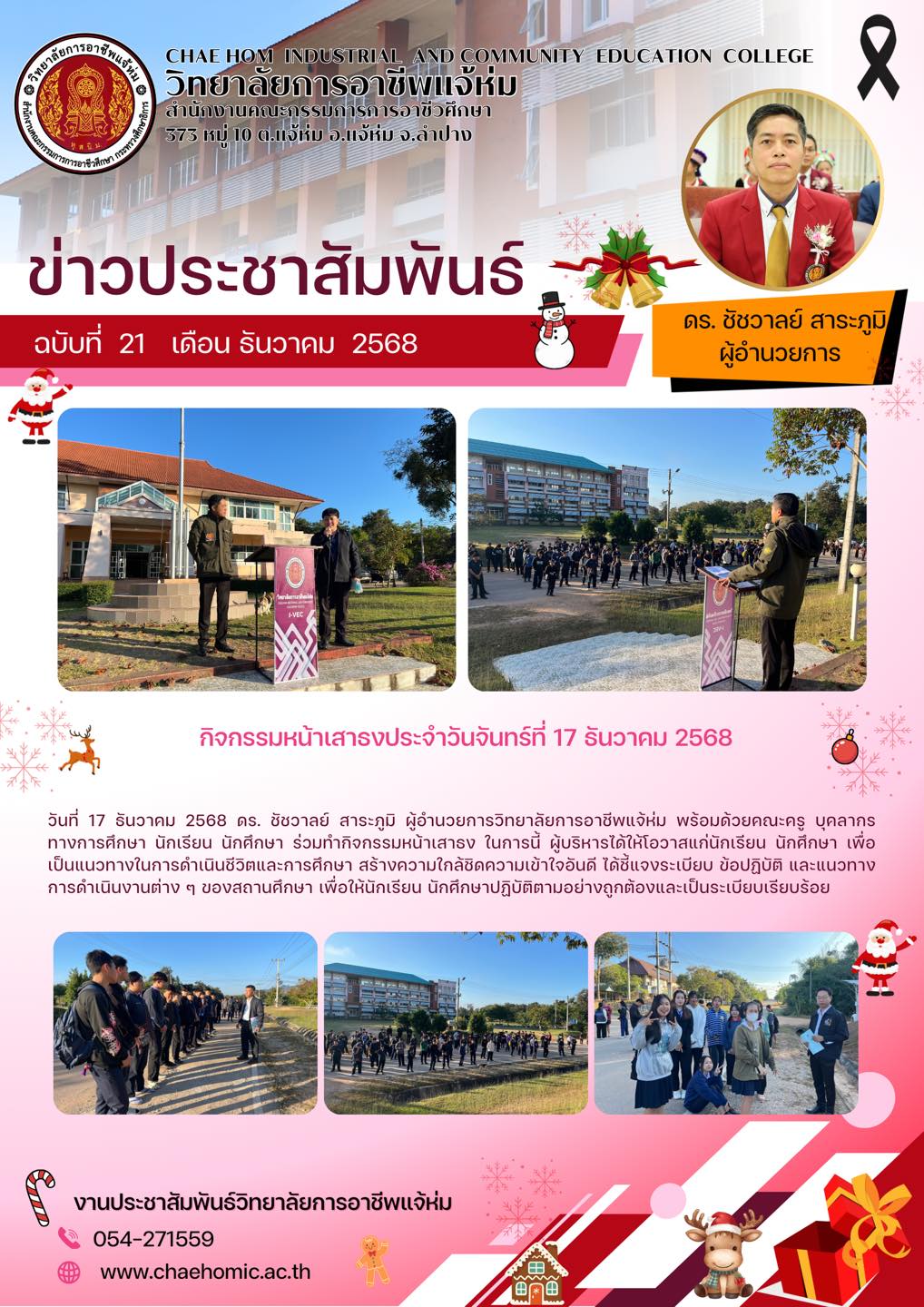 วันที่ 17 ธันวาคม 2568 ดร. ชัชวาลย์ สาระภูมิ ผู้อำนวยการวิทยาลัยการอาชีพแจ้ห่ม พร้อมด้วยคณะครู บุคลากรทางการศึกษา นักเรียน นักศึกษา ร่วมทำกิจกรรมหน้าเสาธง ในการนี้ ผู้บริหารได้ให้โอวาสแก่นักเรียน นักศึกษา เพื่อเป็นแนวทางในการดำเนินชีวิตและการศึกษา สร้างความใกล้ชิดความเข้าใจอันดี ได้ชี้แจงระเบียบ ข้อปฏิบัติ และแนวทางการดำเนินงานต่าง ๆ ของสถานศึกษา เพื่อให้นักเรียน นักศึกษาปฏิบัติตามอย่างถูกต้องและเป็นระเบียบเรียบร้อย