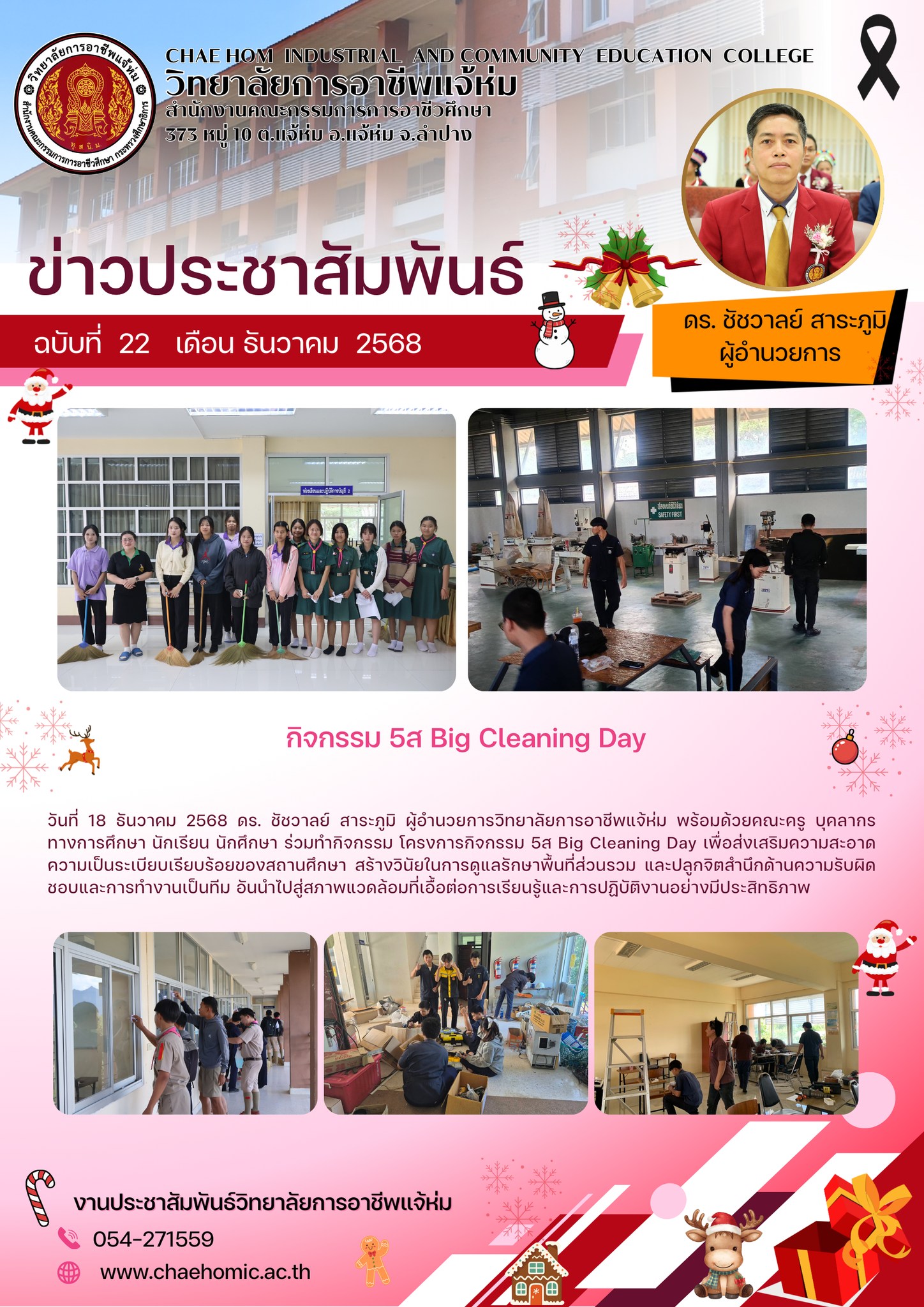 วันที่ 18 ธันวาคม 2568 ดร. ชัชวาลย์ สาระภูมิ ผู้อำนวยการวิทยาลัยการอาชีพแจ้ห่ม พร้อมด้วยคณะครู บุคลากรทางการศึกษา นักเรียน นักศึกษา ร่วมทำกิจกรรม โครงการกิจกรรม 5ส Big Cleaning Day เพื่อส่งเสริมความสะอาด ความเป็นระเบียบเรียบร้อยของสถานศึกษา สร้างวินัยในการดูแลรักษาพื้นที่ส่วนรวม และปลูกจิตสำนึกด้านความรับผิดชอบและการทำงานเป็นทีม อันนำไปสู่สภาพแวดล้อมที่เอื้อต่อการเรียนรู้และการปฏิบัติงานอย่างมีประสิทธิภาพ