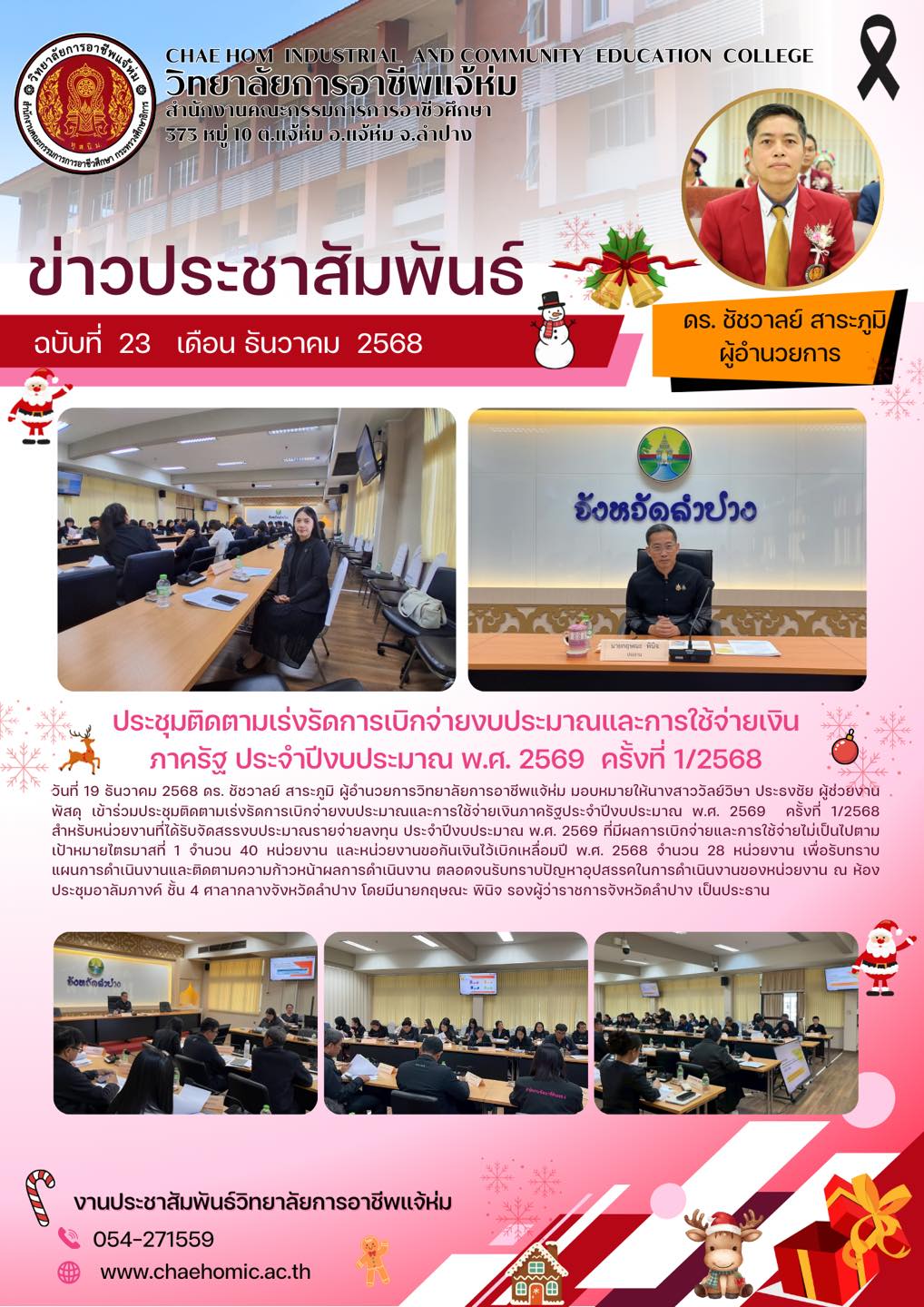 วันที่ 19 ธันวาคม 2568 ดร. ชัชวาลย์ สาระภูมิ ผู้อำนวยการวิทยาลัยการอาชีพแจ้ห่ม มอบหมายให้นางสาววัลย์วิษา ประธงชัย ผู้ช่วยงานพัสดุ เข้าร่วมประชุมติดตามเร่งรัดการเบิกจ่ายงบประมาณและการใช้จ่ายเงินภาครัฐประจำปีงบประมาณ พ.ศ. 2569 ครั้งที่ 1/2568 สำหรับหน่วยงานที่ได้รับจัดสรรงบประมาณรายจ่ายลงทุน ประจำปีงบประมาณ พ.ศ. 2569 ที่มีผลการเบิกจ่ายและการใช้จ่ายไม่เป็นไปตามเป้าหมายไตรมาสที่ 1 จำนวน 40 หน่วยงาน และหน่วยงานขอกันเงินไว้เบิกเหลื่อมปี พ.ศ. 2568 จำนวน 28 หน่วยงาน เพื่อรับทราบแผนการดำเนินงานและติดตามความก้าวหน้าผลการดำเนินงาน ตลอดจนรับทราบปัญหาอุปสรรคในการดำเนินงานของหน่วยงาน ณ ห้องประชุมอาลัมภางค์ ชั้น 4 ศาลากลางจังหวัดลำปาง โดยมีนายกฤษณะ พินิจ รองผู้ว่าราชการจังหวัดลำปาง เป็นประธาน