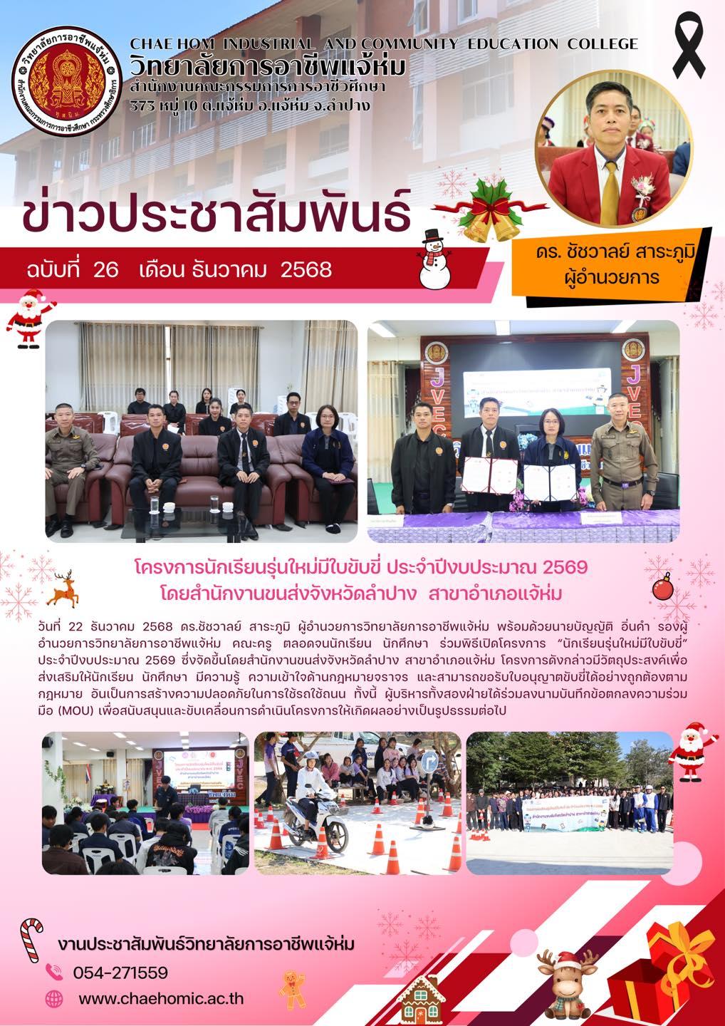 วันที่ 22 ธันวาคม 2568 ดร.ชัชวาลย์ สาระภูมิ ผู้อำนวยการวิทยาลัยการอาชีพแจ้ห่ม พร้อมด้วยนายบัญญัติ อิ่นคำ รองผู้อำนวยการวิทยาลัยการอาชีพแจ้ห่ม คณะครู ตลอดจนนักเรียน นักศึกษา ร่วมพิธีเปิดโครงการ “นักเรียนรุ่นใหม่มีใบขับขี่” ประจำปีงบประมาณ 2569 ซึ่งจัดขึ้นโดยสำนักงานขนส่งจังหวัดลำปาง สาขาอำเภอแจ้ห่ม โครงการดังกล่าวมีวัตถุประสงค์เพื่อส่งเสริมให้นักเรียน นักศึกษา มีความรู้ ความเข้าใจด้านกฎหมายจราจร และสามารถขอรับใบอนุญาตขับขี่ได้อย่างถูกต้องตามกฎหมาย อันเป็นการสร้างความปลอดภัยในการใช้รถใช้ถนน ทั้งนี้ ผู้บริหารทั้งสองฝ่ายได้ร่วมลงนามบันทึกข้อตกลงความร่วมมือ (MOU) เพื่อสนับสนุนและขับเคลื่อนการดำเนินโครงการให้เกิดผลอย่างเป็นรูปธรรมต่อไป