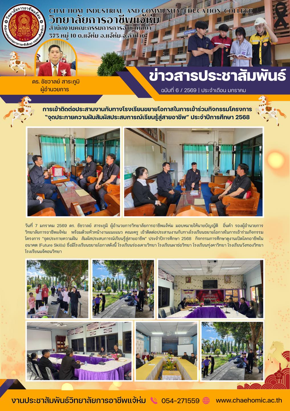 วันที่ 7 มกราคม 2569 ดร. ชัชวาลย์ สาระภูมิ ผู้อำนวยการวิทยาลัยการอาชีพแจ้ห่ม มอบหมายให้นายบัญญัติ อิ่นคำ รองผู้อำนวยการวิทยาลัยการอาชีพแจ้ห่ม พร้อมด้วยหัวหน้างานแนะแนว คณะครู เข้าติดต่อประสานงานกับทางโรงเรียนขยายโอกาสในการเข้าร่วมกิจกรรมโครงการ “จุดประกายความฝัน สัมผัสประสบการณ์เรียนรู้สู่สายอาชีพ” ประจำปีการศึกษา 2568 กิจกรรมการศึกษาดูงานเปิดโลกอาชีพในอนาคต (Future Skills) ซึ่งมีโรงเรียนขยายโอกาสดังนี้ โรงเรียนร่องเคาะวิทยา โรงเรียนผาช่อวิทยา โรงเรียนทุ่งคาวิทยา โรงเรียนวังทองวิทยา โรงเรียนแจ้คอนวิทยา
