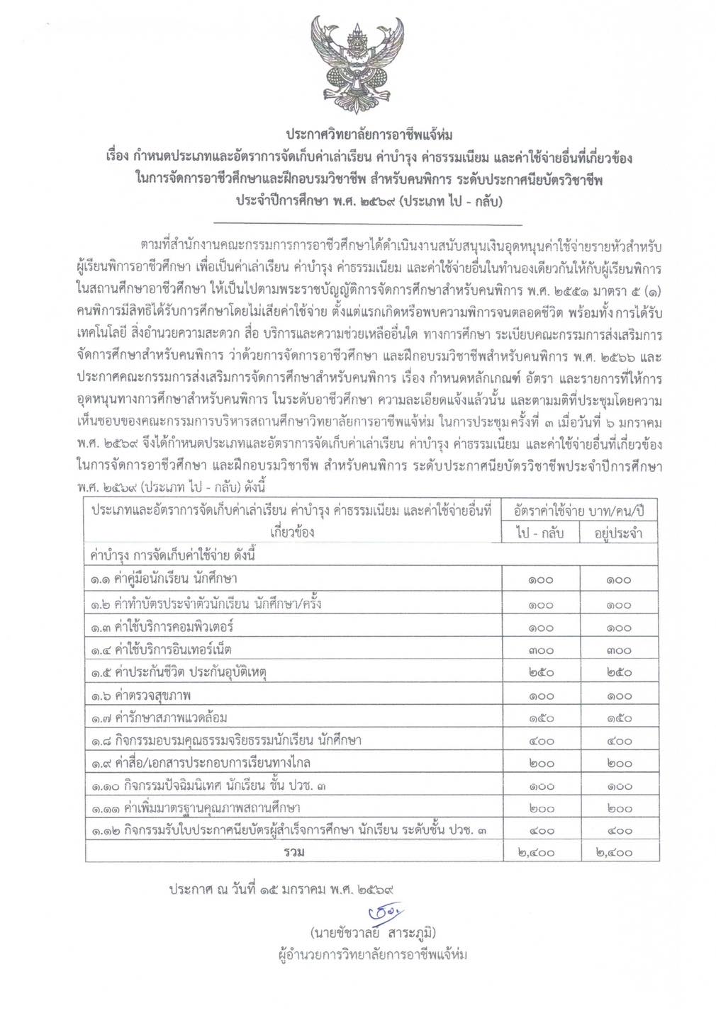ประกาศวิทยาลัยการอาชีพแจ้ห่ม เรื่อง กำหนดประเภทและอัตราการจัดเก็บค่าเล่าเรียน ค่าบำรุง ค่าธรรมเนียม และ ค่า ใช้จ่ายอื่นที่เกี่ยวข้องในการจัดการอาชีวศึกษาและฝึกอบรมวิชาชีพ สำหรับคนพิการ ระดับประกาศนียบัตรวิชาชีพประจำปีการศึกษา พ.ศ. ๒๕๖๙ (ประเภท ไป – กลับ)