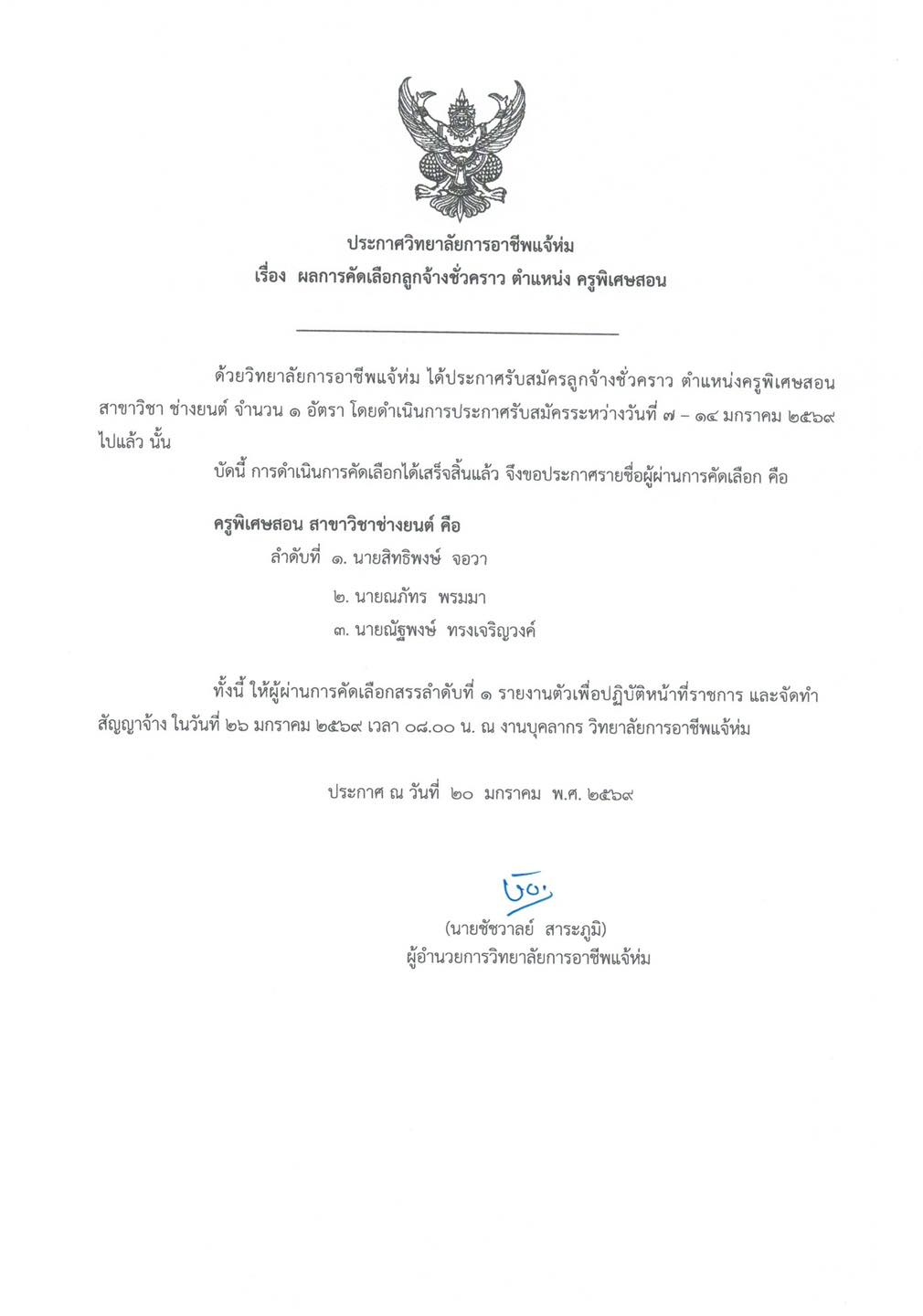 ประกาศ ผลการคัดเลือกลูกจ้างชั่วคราว ตำแหน่งครูพิเศษสอน สาขาวิชา ช่างยนต์