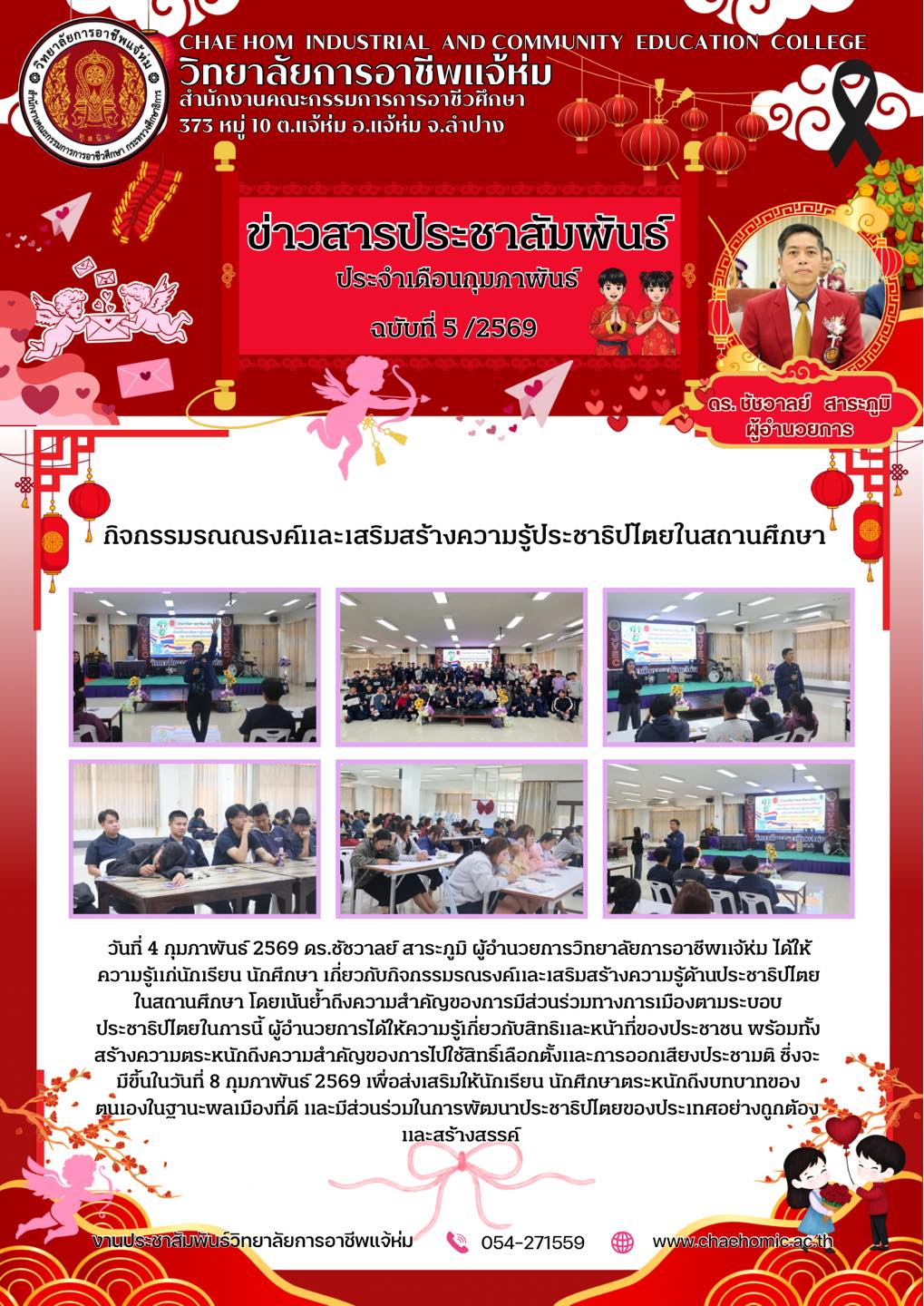 วันที่ 4 กุมภาพันธ์ 2569 ดร.ชัชวาลย์ สาระภูมิ ผู้อำนวยการวิทยาลัยการอาชีพแจ้ห่ม ได้ให้ความรู้แก่นักเรียน นักศึกษา เกี่ยวกับกิจกรรมรณรงค์และเสริมสร้างความรู้ด้านประชาธิปไตยในสถานศึกษา โดยเน้นย้ำถึงความสำคัญของการมีส่วนร่วมทางการเมืองตามระบอบประชาธิปไตยในการนี้ ผู้อำนวยการได้ให้ความรู้เกี่ยวกับสิทธิและหน้าที่ของประชาชน พร้อมทั้งสร้างความตระหนักถึงความสำคัญของการไปใช้สิทธิ์เลือกตั้งและการออกเสียงประชามติ ซึ่งจะมีขึ้นในวันที่ 8 กุมภาพันธ์ 2569 เพื่อส่งเสริมให้นักเรียน นักศึกษาตระหนักถึงบทบาทของตนเองในฐานะพลเมืองที่ดี และมีส่วนร่วมในการพัฒนาประชาธิปไตยของประเทศอย่างถูกต้องและสร้างสรรค์