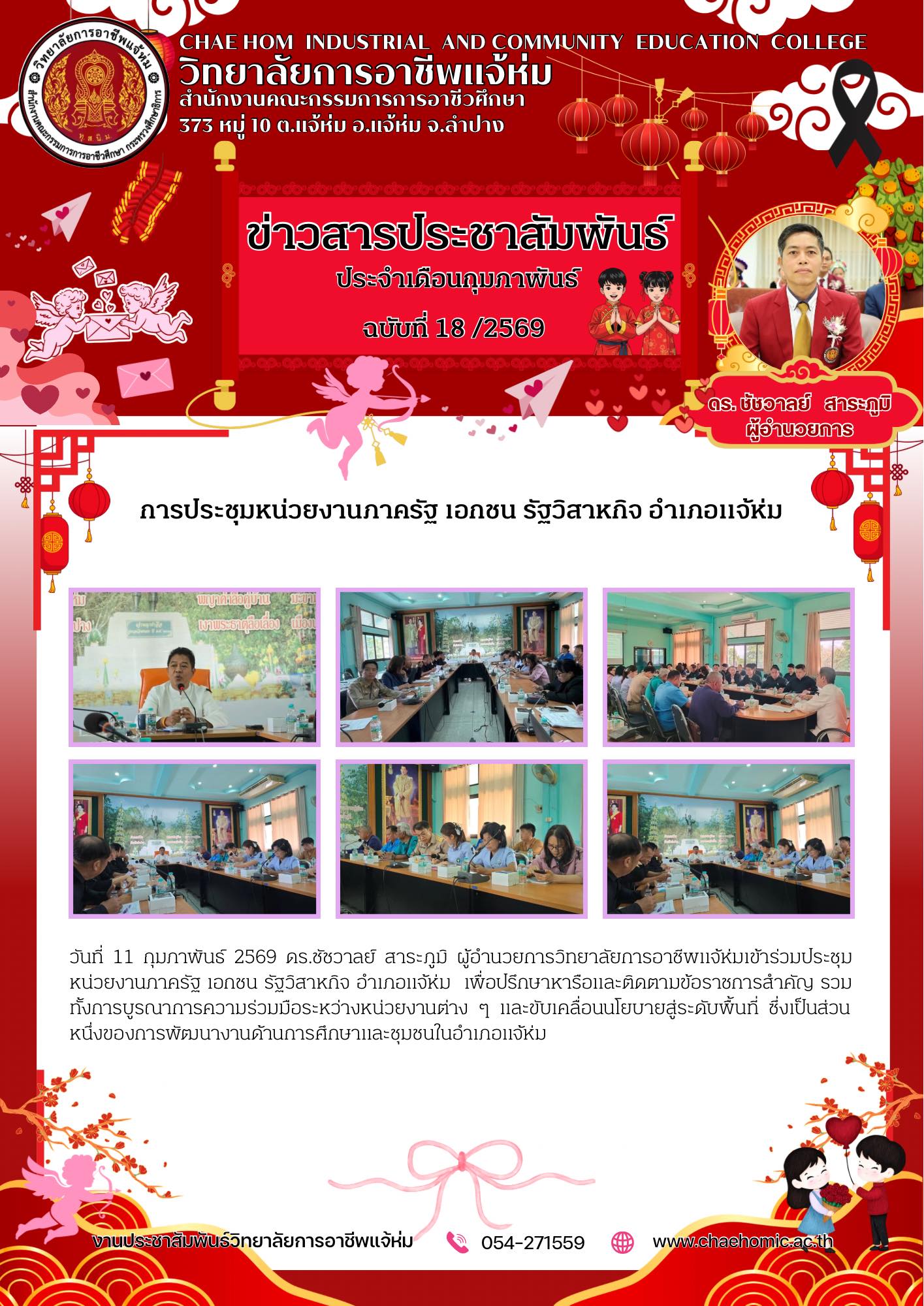 วันที่ 11 กุมภาพันธ์ 2569 ดร.ชัชวาลย์ สาระภูมิ ผู้อำนวยการวิทยาลัยการอาชีพแจ้ห่มเข้าร่วมประชุมหน่วยงานภาครัฐ เอกชน รัฐวิสาหกิจ อำเภอแจ้ห่ม เพื่อปรึกษาหารือและติดตามข้อราชการสำคัญ รวมทั้งการบูรณาการความร่วมมือระหว่างหน่วยงานต่าง ๆ และขับเคลื่อนนโยบายสู่ระดับพื้นที่ ซึ่งเป็นส่วนหนึ่งของการพัฒนางานด้านการศึกษาและชุมชนในอำเภอแจ้ห่ม