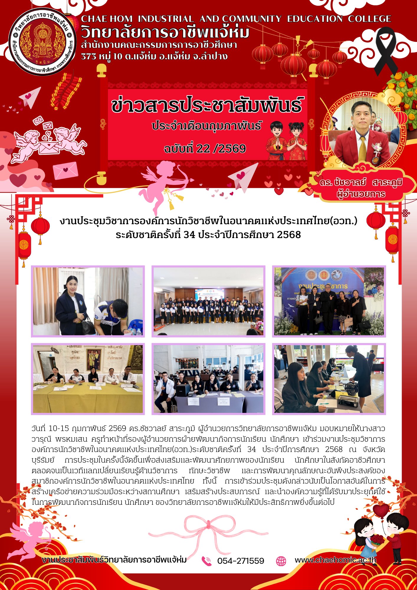 วันที่ 10-15 กุมภาพันธ์ 2569 ดร.ชัชวาลย์ สาระภูมิ ผู้อำนวยการวิทยาลัยการอาชีพแจ้ห่ม มอบหมายให้นางสาววารุณี พรหมเสน ครูทำหน้าที่รองผู้อำนวยการฝ่ายพัฒนากิจการนักเรียน นักศึกษา เข้าร่วมงานประชุมวิชาการองค์การนักวิชาชีพในอนาคตแห่งประเทศไทย(อวท.)ระดับชาติครั้งที่ 34 ประจำปีการศึกษา 2568 ณ จังหวัดบุรีรัมย์ การประชุมในครั้งนี้จัดขึ้นเพื่อส่งเสริมและพัฒนาศักยภาพของนักเรียน นักศึกษาในสังกัดอาชีวศึกษา ตลอดจนเป็นเวทีแลกเปลี่ยนเรียนรู้ด้านวิชาการ ทักษะวิชาชีพ และการพัฒนาคุณลักษณะอันพึงประสงค์ของสมาชิกองค์การนักวิชาชีพในอนาคตแห่งประเทศไทย ทั้งนี้ การเข้าร่วมประชุมดังกล่าวนับเป็นโอกาสอันดีในการสร้างเครือข่ายความร่วมมือระหว่างสถานศึกษา เสริมสร้างประสบการณ์ และนำองค์ความรู้ที่ได้รับมาประยุกต์ใช้ในการพัฒนากิจการนักเรียน นักศึกษา ของวิทยาลัยการอาชีพแจ้ห่มให้มีประสิทธิภาพยิ่งขึ้นต่อไป