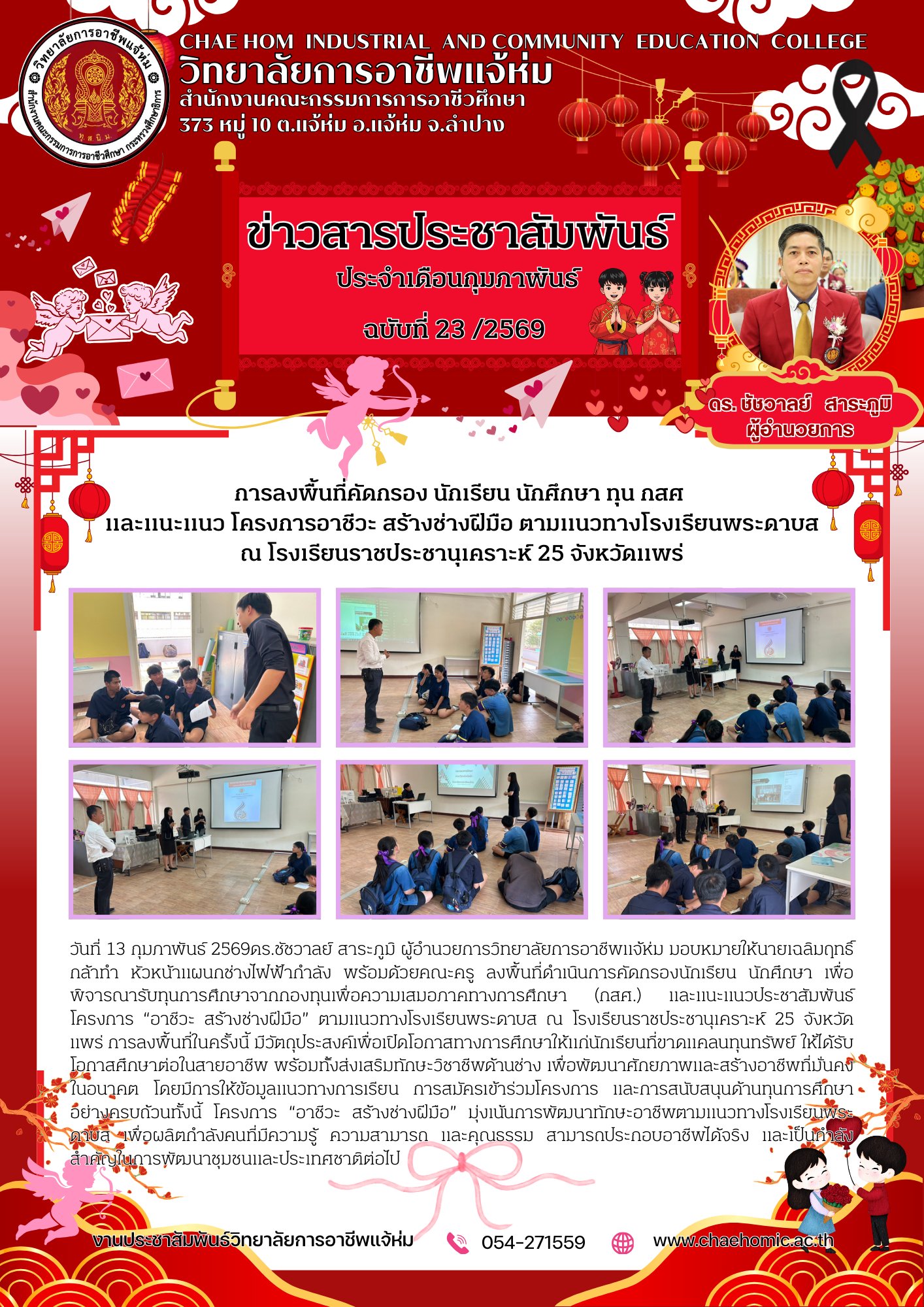 วันที่ 13 กุมภาพันธ์ 2569ดร.ชัชวาลย์ สาระภูมิ ผู้อำนวยการวิทยาลัยการอาชีพแจ้ห่ม มอบหมายให้นายเฉลิมฤทธิ์ กล้าทำ หัวหน้าแผนกช่างไฟฟ้ากำลัง พร้อมด้วยคณะครู ลงพื้นที่ดำเนินการคัดกรองนักเรียน นักศึกษา เพื่อพิจารณารับทุนการศึกษาจากกองทุนเพื่อความเสมอภาคทางการศึกษา (กสศ.) และแนะแนวประชาสัมพันธ์โครงการ “อาชีวะ สร้างช่างฝีมือ” ตามแนวทางโรงเรียนพระดาบส ณ โรงเรียนราชประชานุเคราะห์ 25 จังหวัดแพร่การลงพื้นที่ในครั้งนี้ มีวัตถุประสงค์เพื่อเปิดโอกาสทางการศึกษาให้แก่นักเรียนที่ขาดแคลนทุนทรัพย์ ให้ได้รับโอกาสศึกษาต่อในสายอาชีพ พร้อมทั้งส่งเสริมทักษะวิชาชีพด้านช่าง เพื่อพัฒนาศักยภาพและสร้างอาชีพที่มั่นคงในอนาคต โดยมีการให้ข้อมูลแนวทางการเรียน การสมัครเข้าร่วมโครงการ และการสนับสนุนด้านทุนการศึกษาอย่างครบถ้วนทั้งนี้ โครงการ “อาชีวะ สร้างช่างฝีมือ” มุ่งเน้นการพัฒนาทักษะอาชีพตามแนวทางโรงเรียนพระดาบส เพื่อผลิตกำลังคนที่มีความรู้ ความสามารถ และคุณธรรม สามารถประกอบอาชีพได้จริง และเป็นกำลังสำคัญในการพัฒนาชุมชนและประเทศชาติต่อไป