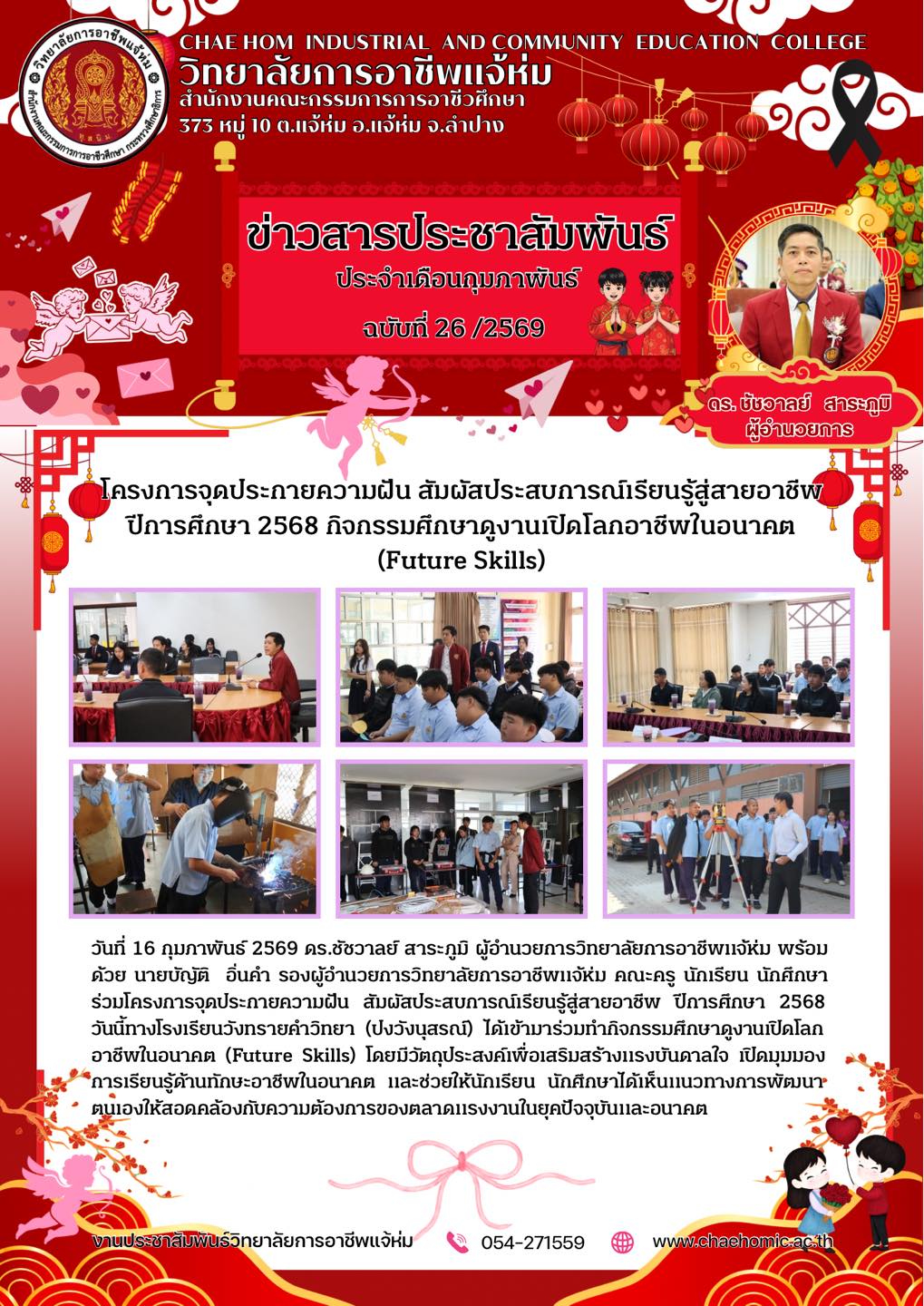 วันที่ 16 กุมภาพันธ์ 2569 ดร.ชัชวาลย์ สาระภูมิ ผู้อำนวยการวิทยาลัยการอาชีพแจ้ห่ม พร้อมด้วย นายบัญญัติ อิ่นคำ รองผู้อำนวยการวิทยาลัยการอาชีพแจ้ห่ม คณะครู นักเรียน นักศึกษา ร่วมโครงการจุดประกายความฝัน สัมผัสประสบการณ์เรียนรู้สู่สายอาชีพ ปีการศึกษา 2568 วันนี้ทางโรงเรียนวังทรายคำวิทยา (ปงวังนุสรณ์) ได้เข้ามาร่วมทำกิจกรรมศึกษาดูงานเปิดโลกอาชีพในอนาคต (Future Skills) โดยมีวัตถุประสงค์เพื่อเสริมสร้างแรงบันดาลใจ เปิดมุมมองการเรียนรู้ด้านทักษะอาชีพในอนาคต และช่วยให้นักเรียน นักศึกษาได้เห็นแนวทางการพัฒนาตนเองให้สอดคล้องกับความต้องการของตลาดแรงงานในยุคปัจจุบันและอนาคต