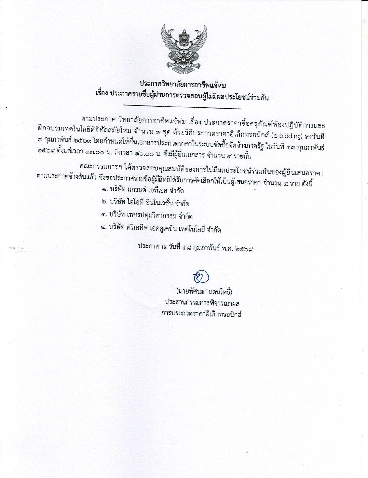 ประกาศรายชื่อผู้ผ่านการตรวจสอบผู้ไม่มีผลประโยชน์ร่วมกัน