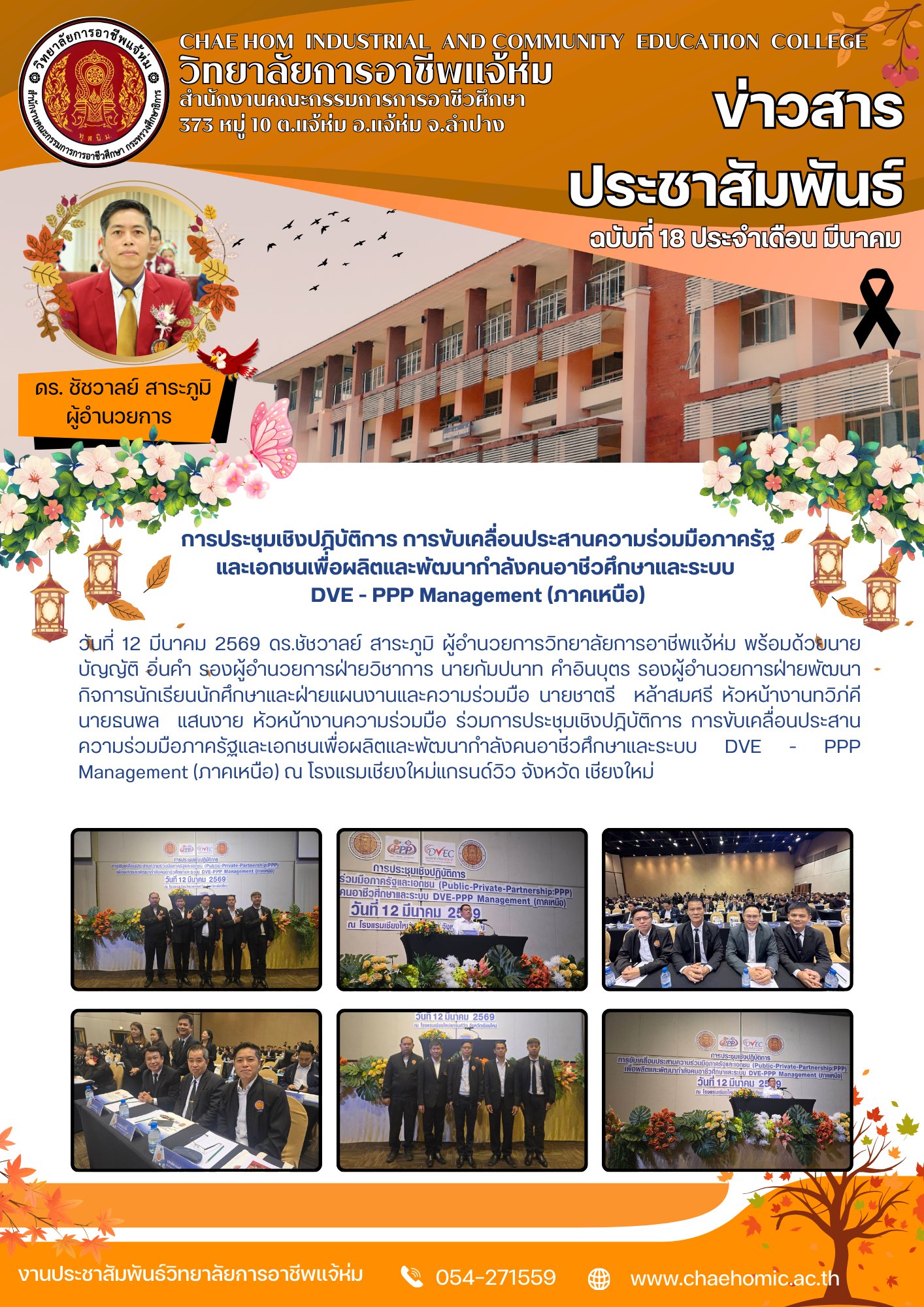 วันที่ 12 มีนาคม 2569 ดร.ชัชวาลย์ สาระภูมิ ผู้อำนวยการวิทยาลัยการอาชีพแจ้ห่ม พร้อมด้วยนายบัญญัติ อิ่นคำ รองผู้อำนวยการฝ่ายวิชาการ นายกัมปนาท คำอินบุตร รองผู้อำนวยการฝ่ายพัฒนากิจการนักเรียนนักศึกษาและฝ่ายแผนงานและความร่วมมือ นายชาตรี หล้าสมศรี หัวหน้างานทวิภ่คี นายธนพล แสนงาย หัวหน้างานความร่วมมือ ร่วมการประชุมเชิงปฎิบัติการ การขับเคลื่อนประสานความร่วมมือภาครัฐและเอกชนเพื่อผลิตและพัฒนากำลังคนอาชีวศึกษาและระบบ DVE – PPP Management (ภาคเหนือ) ณ โรงแรมเชียงใหม่แกรนด์วิว จังหวัด เชียงใหม่