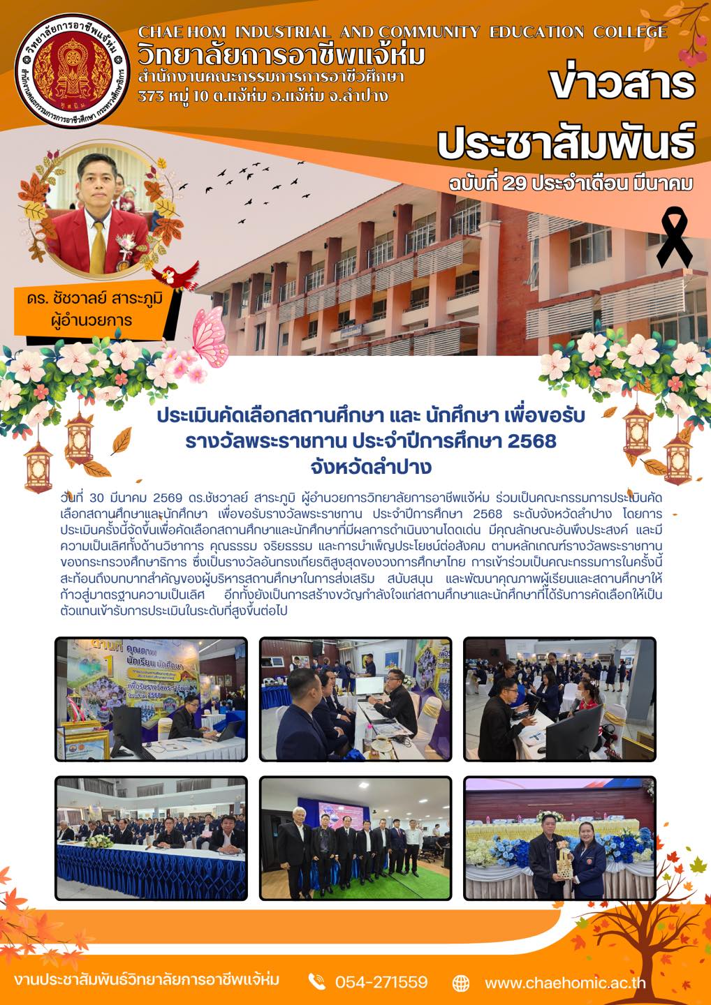 วันที่ 30 มีนาคม 2569 ดร.ชัชวาลย์ สาระภูมิ ผู้อำนวยการวิทยาลัยการอาชีพแจ้ห่ม ร่วมเป็นคณะกรรมการประเมินคัดเลือกสถานศึกษาและนักศึกษา เพื่อขอรับรางวัลพระราชทาน ประจำปีการศึกษา 2568 ระดับจังหวัดลำปาง โดยการประเมินครั้งนี้จัดขึ้นเพื่อคัดเลือกสถานศึกษาและนักศึกษาที่มีผลการดำเนินงานโดดเด่น มีคุณลักษณะอันพึงประสงค์ และมีความเป็นเลิศทั้งด้านวิชาการ คุณธรรม จริยธรรม และการบำเพ็ญประโยชน์ต่อสังคม ตามหลักเกณฑ์รางวัลพระราชทานของกระทรวงศึกษาธิการ ซึ่งเป็นรางวัลอันทรงเกียรติสูงสุดของวงการศึกษาไทย การเข้าร่วมเป็นคณะกรรมการในครั้งนี้ สะท้อนถึงบทบาทสำคัญของผู้บริหารสถานศึกษาในการส่งเสริม สนับสนุน และพัฒนาคุณภาพผู้เรียนและสถานศึกษาให้ก้าวสู่มาตรฐานความเป็นเลิศ อีกทั้งยังเป็นการสร้างขวัญกำลังใจแก่สถานศึกษาและนักศึกษาที่ได้รับการคัดเลือกให้เป็นตัวแทนเข้ารับการประเมินในระดับที่สูงขึ้นต่อไป