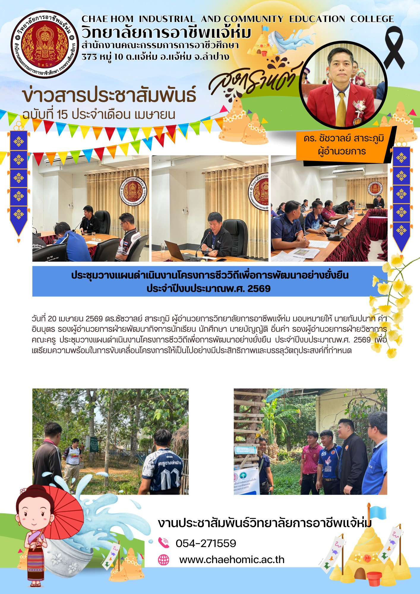 วันที่ 20 เมษายน 2569 ดร.ชัชวาลย์ สาระภูมิ ผู้อำนวยการวิทยาลัยการอาชีพแจ้ห่ม มอบหมายให้ นายกัมปนาท คำอินบุตร รองผู้อำนวยการฝ่ายพัฒนากิจการนักเรียน นักศึกษา นายบัญญัติ อิ่นคำ รองผู้อำนวยการฝ่ายวิชาการ คณะครู ประชุมวางแผนดำเนินงานโครงการชีววิถีเพื่อการพัฒนาอย่างยั่งยืน ประจำปีงบประมาณพ.ศ. 2569 เพื่อเตรียมความพร้อมในการขับเคลื่อนโครงการให้เป็นไปอย่างมีประสิทธิภาพและบรรลุวัตถุประสงค์ที่กำหนด