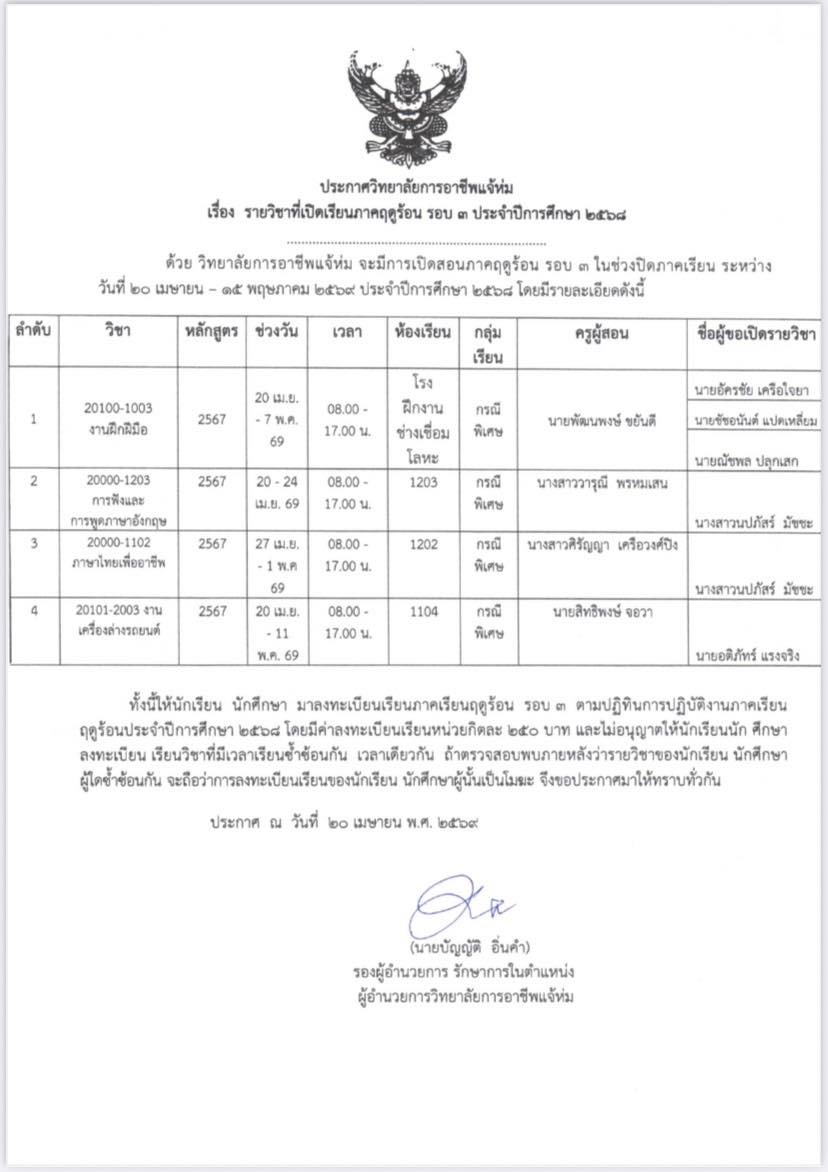 เรื่อง รายวิชาเปิดภาคเรียนฤดูร้อนรอบที่ 3 ประจำปีการศึกษา 2568 ระหว่างวันที่ 20 – 15 พฤษภาคม 2569