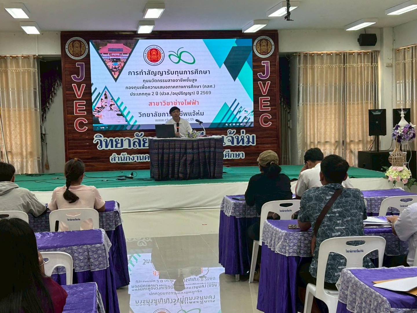 วันที่ 24 เมษายน 2569 ดร.ชัชวาลย์ สาระภูมิ ผู้อำนวยการวิทยาลัยการอาชีพแจ้ห่ม มอบหมายให้นายบัญญัติ อิ่นคำ รองผู้อำนวยการ พร้อมด้วยคณะครู ร่วมการทำสัญญานักศึกษาทุนนวัตกรรมสายอาชีพชั้นสูง กองทุนเพื่อความเสมอภาคทางการศึกษา ประเภททุน 2 ปี (ปวส./อนุปริญญา) สาขาวิชาช่างไฟฟ้า ในการนี้ ผู้อำนวยการวิทยาลัยฯ ได้ร่วมวีดิทัศน์พบปะพูดคุยกับผู้ปกครอง เพื่อสร้างความเข้าใจและความเชื่อมั่นในการจัดการศึกษา พร้อมทั้งส่งเสริมและสนับสนุนโอกาสทางการศึกษาแก่ผู้เรียนสายอาชีพ ให้มีความพร้อมในการพัฒนาทักษะวิชาชีพอย่างมีคุณภาพต่อไป